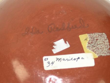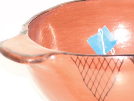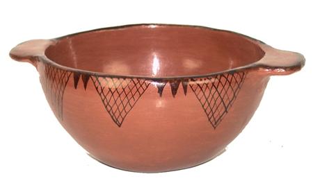 Circa Mid 1900s, Beautiful black-on-red bowl with two handles and cross-hatched half diamond design. Very good condition. 3-1/2" x 9-1/2" x 7"