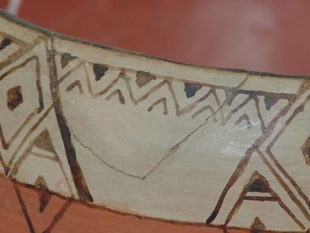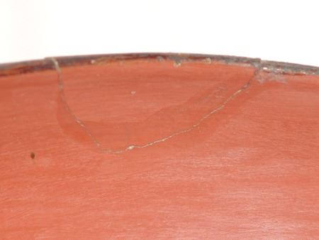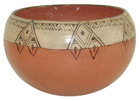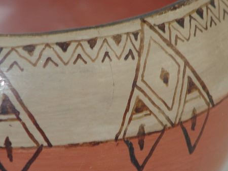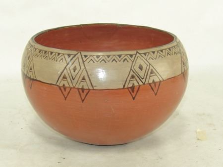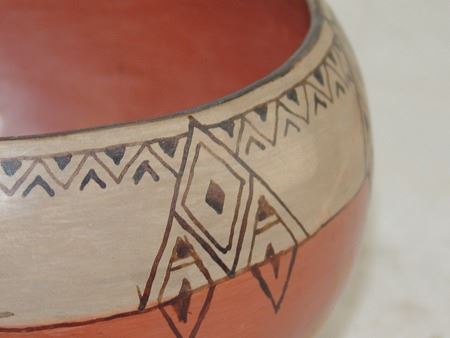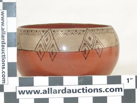 Ca. 1940s, A vintage black and white-on-red thin walled pottery bowl with fine banded design near the rim. Good condition, one repaired rim chip. 5-1/2" x 8-1/2"