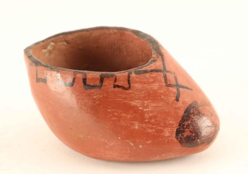 Miniature moccasin with black toe and laces. Signed 'Vesta Bread' measures 3"x1 1/2". Paint at toe is wearing away on right side.
