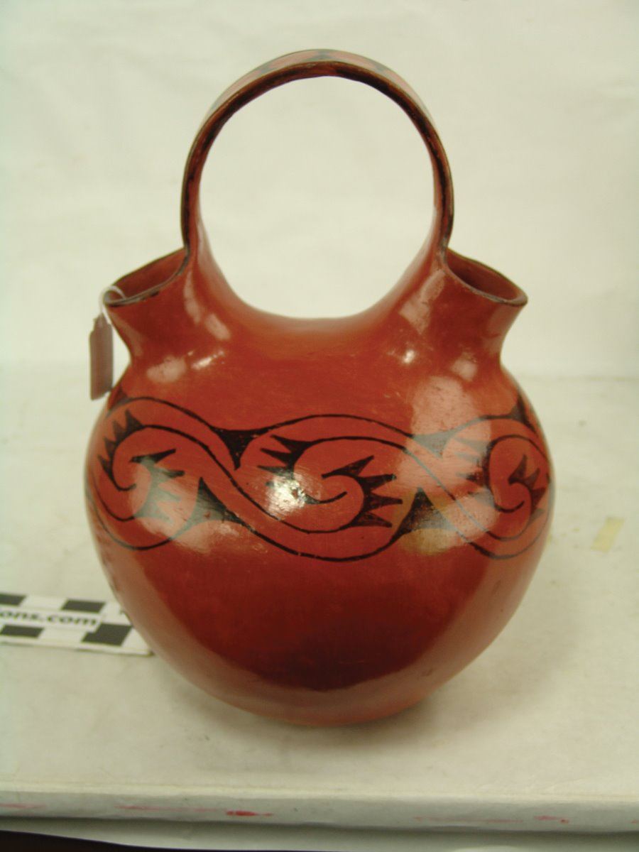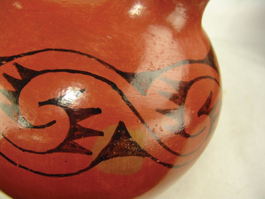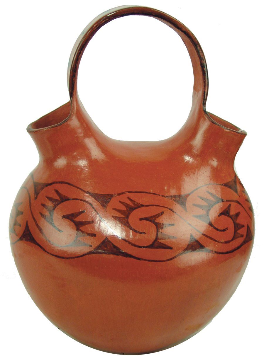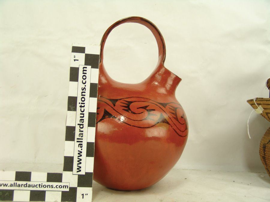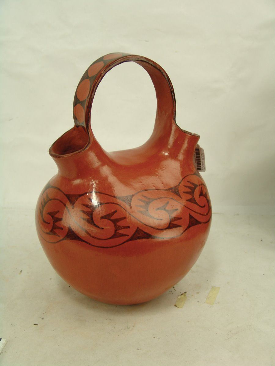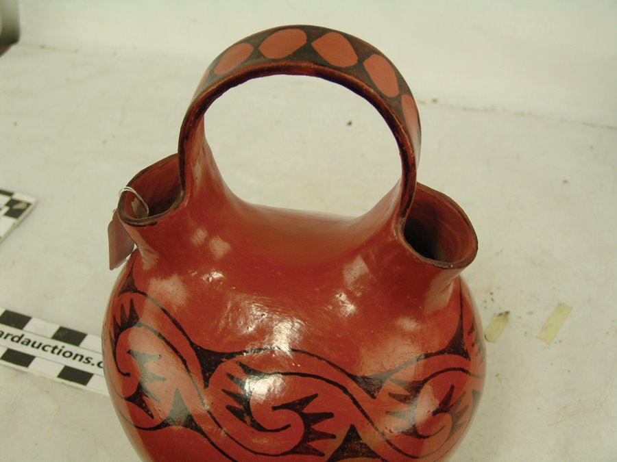 Wonderful burnished black-on-red double-necked pottery jar with flowing band of avian inspired forms. Very good condition. Usual scuffs from use.,Early/Mid 1900s,14" x 10-1/2" x 10-1/2"