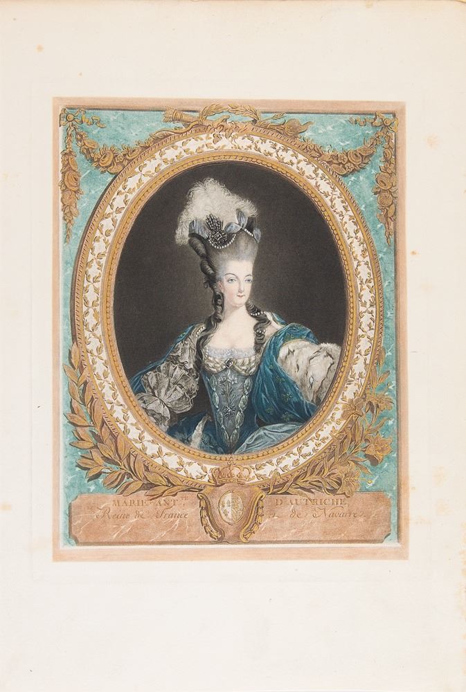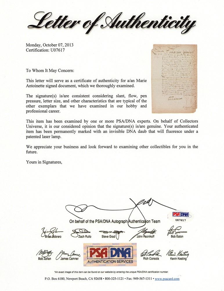 Highly desirable manuscript DS, in French, signed "Payez, Marie Antoinette," one page, 9.5 x 14.5, October 1, 1786. Headed at the top, "To the Writing-Master of the Pages," Marie Antoinette orders her General Treasurer Marc Antoine Francois Randon de la Tour to make use of "the funds provided by the state for the maintenance and sustenance of many of our officers during the present year," and pay Simon Dessalles, Writing-Master, 136 livres,17 sols, and 6 deniers in cash, "Which we have granted him for his subsistence in consideration of his having taught penmanship to our pages during the Quarter of July, August and September last." She asks that the amount be paid by, "our dear and Well beloved people in charge of the Accounts of the King, our most Honored Lord and Husband in Paris," and requests them to make the payment without difficulty. In fine condition, with paper loss to two corner tips, a bit of mild soiling and creasing, and a small tape repair to reverse. Countersigned by her secretary Nicolas Beaugeard, later wounded defending Louis XVI from a dagger thrust. Dessalle taught penmanship to Marie Antoinette's pages and also to her children. He told the Dauphin to wear a Liberty Bonnet at the start of the Revolution. Accompanied by a full letter of authenticity from PSA/DNA and an attractive hand-colored engraved portrait.