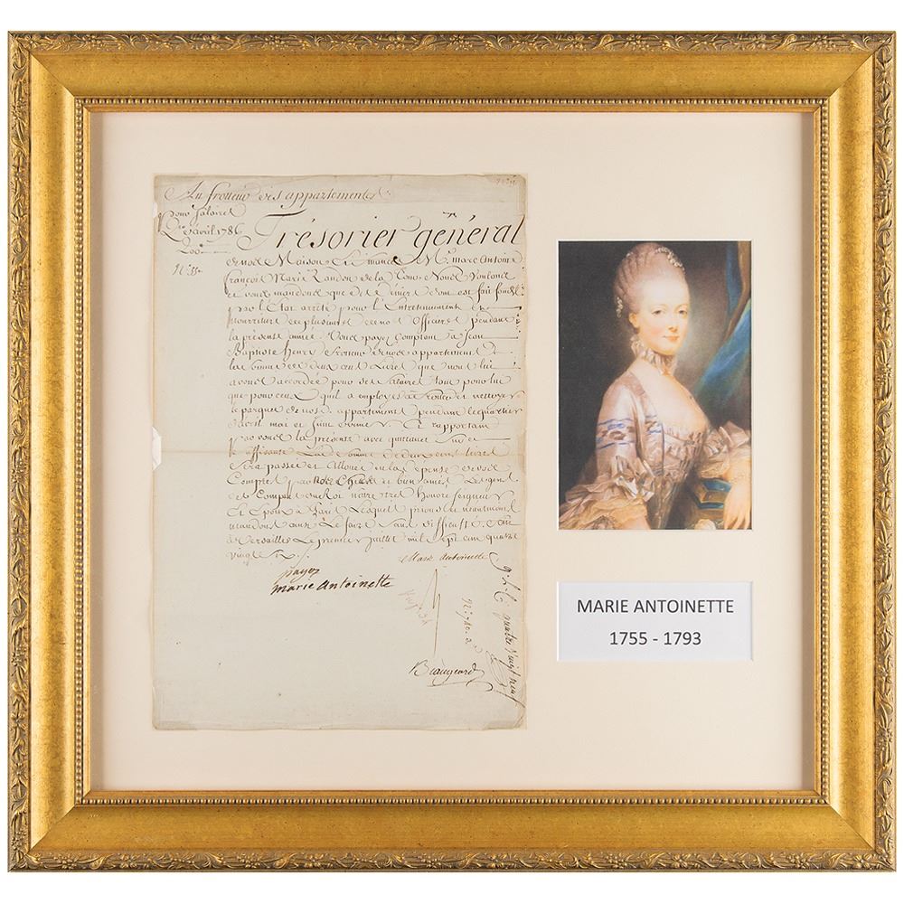 Manuscript DS in French, signed "Payez, Marie Antoinette," one page, 9.5 x 14.5, July 1, 1786. A document concerning payment for one of her “apartment floor shiners,” in part (translated): “From our House and Treasury Mr. Marc-Antoine Francois Marie Randon de La Tour, we want and ask you that from this denier which is funded by state order for upkeep and food for several of our officers for the current year, you pay cash to Jean Baptiste Henry [floor] shiner of our apartment the amount of two hundred pounds that we have granted him for this salary as much for him as for the one he has employed to scrub and clean the parquet of our apartment during a quarter of April, last May, and June and you reporting the present with receipt to be sufficient. The amount of two hundred pounds will be passed and allotted as an expense from your accounts by our dear and beloved general, accountant to the King our very honored Lord and spouse in Paris to the both of whom we ask and nonetheless also ask to do as such without difficulties." Signed boldly at the conclusion by the queen of France. Archivally mounted, matted, and framed with a caption and artistic portrait to an overall size of 23 x 21.75. In fine condition. A very interesting example of the extravagance which contributed to the queen's unpopular image and eventual downfall.
