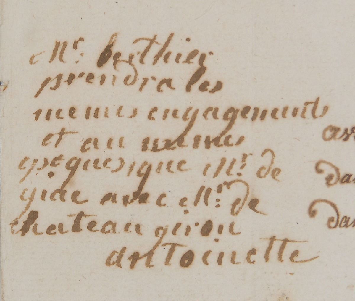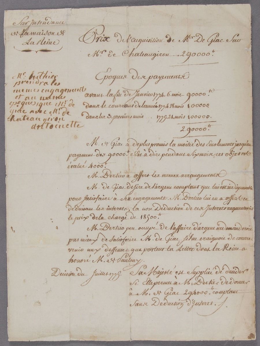 Manuscript DS in French, signed “Antoinette,” one page, 7.5 x 10, July 1779. Marie Antoinette adjudicates a real estate agreement, penning her bold response in the left margin (translated): “Mr. Berthier will make the same arrangements and schedule as Mr. Giac with Mr. Chateaugiron. Antoinette.” The body of the document, in part (translated): “Price of the acquisition of M. Giac on M. Chateaugiron—290,000. Schedule of Payments: Before the end of January 1774, 6 months—90,000. During the year 1774—18 months—100,000. In the first 3 months 1779—21 months—100,000. Total: 290,000. M. Giac also promised half of the salary until the payment of the 90,000. That is to say, for 6 months this object is valued at 4,000. M. Bertier has offered the same arrangements. M. Giac deserves money (immediately available) which is indispensable to him to satisfy the arrangement. M. Bertier offered him some, while deducting the interest. The deduction of this interest would increase the price of the charge by 18,900. M. Bertier, little preoccupied with money matters asks no better to satisfy. M. Giac, not wanting to go against the outline which the Queen's letter provides, has honored M. Seulray. Decision of July 1779. Her majesty is asked to decide if she will permit M. Bertier to give M. Giac 294,000 (immediately available) without deducting interest.” Attractively mounted, cloth-matted and framed with an engraved portrait to an overall size of 22.5 x 18.5. In fine condition, with intersecting folds (one vertical fold passing through a single letter of the signature), scattered creases, and a bit of light soiling. During this period Marie Antoinette began instituting changes in the customs of the French court and would soon abandon her famous wide-hooped pannier dresses for a simpler fashion. Meanwhile, the nation continued to sink into debt. An exceedingly desirable document from one of Europe’s most infamous royals.