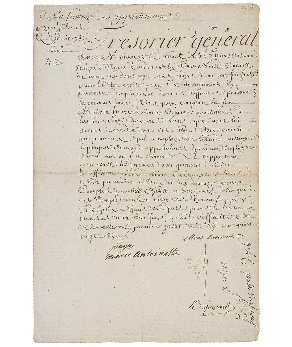 Fabled queen of Louis XVI of France (1755–1793) whose public execution, along with that of her husband, was the most grisly, visible, and powerful symbol of the political aims of the French Revolution. Manuscript DS, in French, signed “Payez, Marie Antoinette,” one page, 9.5 x 14.25, July 1, 1786. Document concerning a payment for one of her “apartment floor shiners.” In part (translated): “ From our House and Treasury Mr. Marc-Antoine François Marie Randon de La Tour, we want and ask you that from this denier which is funded by state order for upkeep and food for several of our officers for current year, you pay cash to Jean Baptiste Henry [floor] shiner of our apartment the amount of two hundred pounds that we have granted him for this salary as much for him as for the one he has employed to scrub and clean the parquet of our apartment during a quarter of April, last May and June and you reporting the present with receipt to be sufficient. The amount of two hundred pounds will be passed and allotted as an expense from your accounts by our dear and beloved general, accountant to the King our very honored Lord and spouse in Paris to the both of whom we ask and nonetheless also ask to do as such without difficulties.” Boldly signed at the conclusion by the queen. In very good to fine condition, with intersecting folds, one through a single letter of signature, scattered creases and edge wear, and mild toning. A very interesting example of the extravagance which contributed to the queen’s unpopular image and eventual downfall.