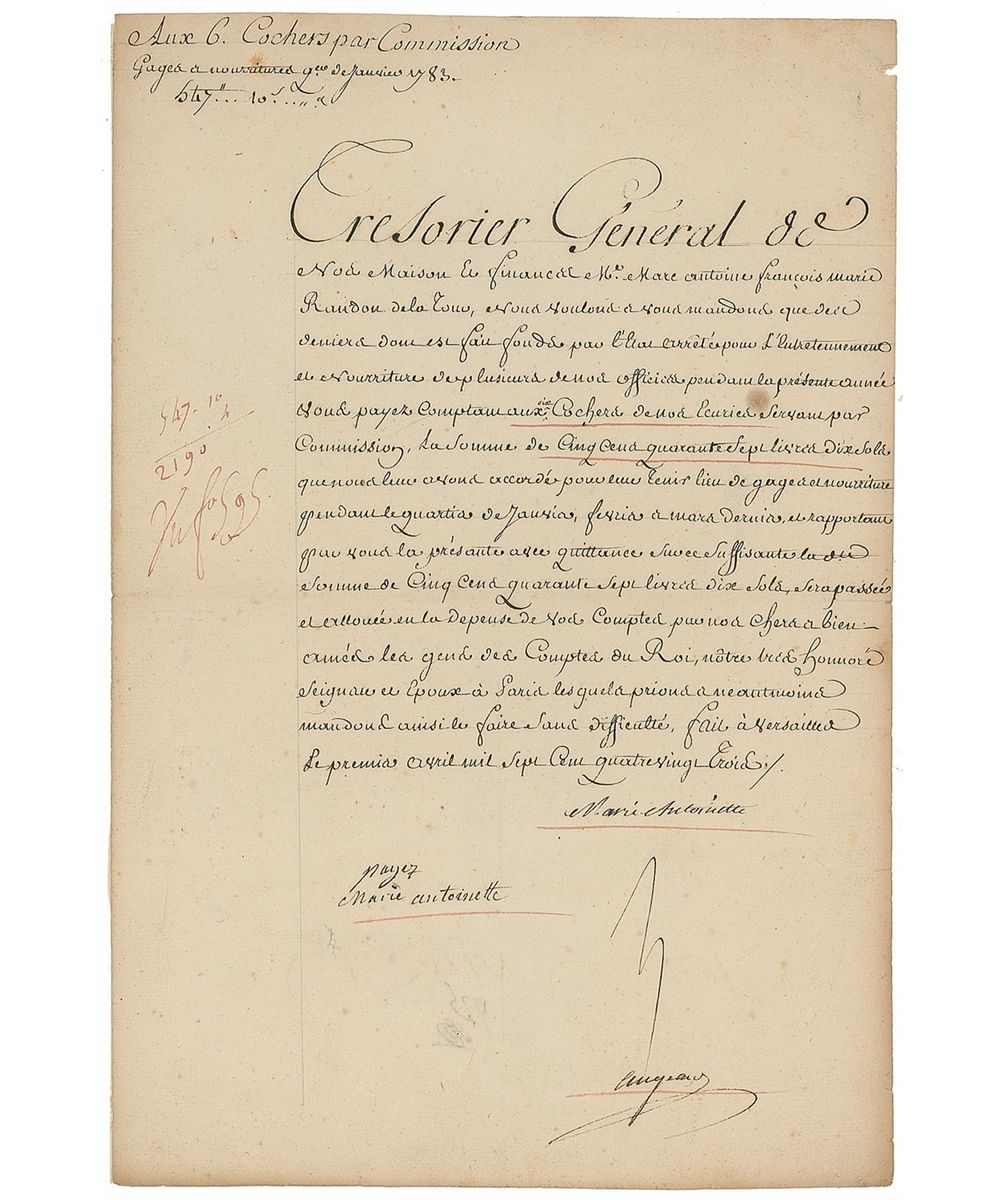 Manuscript DS, in French, signed “Payez, Marie Antoinette,” one page, 9.5 x 14.25, April 1, 1783. Document addressed to the Administrator of the Royal Treasury responsible for the expenditure of the household, M. Marc Antoine Francis de la Tour, Treasurer General at the House of Finances. In full (translated): “Treasurer General of our House and Finances, Master Marc Antoine François Marie Randon de la Tour, we desire and order you that of the money which is appropriated by the state, decreed for the upkeep and nourishment of several of our officers during the present year, you pay in cash to the coachmen of our courier serving by commission the sum of five hundred forty-seven pounds ten sols that we have accorded to them to serve as wages and food allowance during the quarter of January, February and March last, and you bringing back the present letter with a receipt certain and sufficient, the said sum of five hundred forty-seven pounds ten sols will be passed and allocated as expense on your accounts by our dear and beloved personnel of the Accounts of the King, our beloved Lord and spouse in Paris, which we pray and nevertheless order to do this without difficulty. Made at Versailles the first of April one thousand seven hundred eighty-three.” Signed at the conclusion by Antoinette, also bearing Marie’s secretarial proxy signature by Beauregard. In fine condition, with central horizontal and vertical folds, and Antoinette’s signature underlined in red, as well as a couple other passages in the text. The Queen was well-known for indulging her family and those within her household, taking personal interest in their happiness. Items from the reign of the Queen, especially detailing her extravagant spending, are highly sought after by collectors.