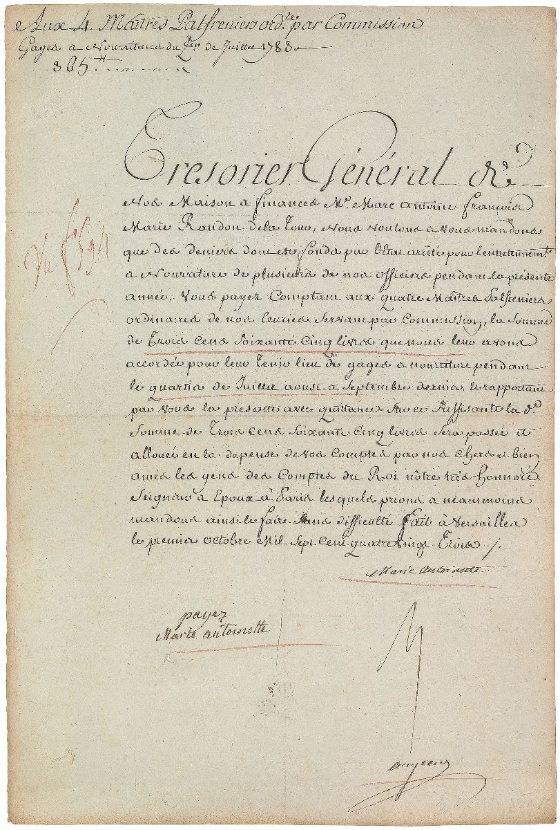 Manuscript DS in French, signed “Payez, Marie Antoinette,” one page, 9.5 x 14.5, October 1, 1783. Document issued at Versailles addressed to “The Treasurer General of Our house and finances M. Marc-Antoine-Francois-Marie Randon de la Tour,” in full (translated): "We want and command the monies mandated by the state and slated for the maintenance and food of several of our officers for the current year. Pay in cash the four master grooms in Our service by commission, the sum of three hundred sixty-five pounds that We granted them for wages and food for the past quarter of July, August and September. Keep this letter as a receipt. The sum of three hundred sixty-five pounds will be granted and allocated to your accounts as an expense for our dear and beloved people to the accounts of the King, Our very honored Lord and Husband.” Boldly signed in the lower left by Marie Antoinette to approve the payment; document also bears Marie’s secretarial proxy signature to the right side. In fine condition, with a small hole beneath the signature, and faint soiling and edge toning. Accompanied by an engraved portrait bearing a facsimile signature.