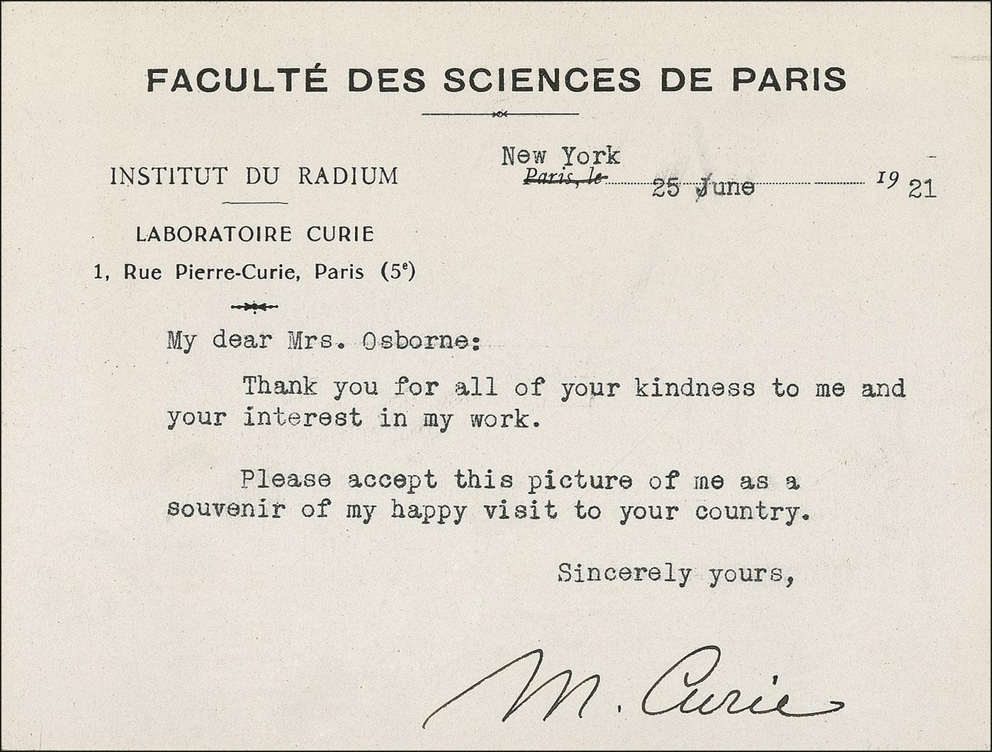 Polish-born French physicist (1867-1934), she and her husband Pierre discovered two new elements, polonium and radium, in 1898. In 1911 she won the Nobel Prize for Chemistry. She died of leukemia brought about by her work with radioactive material. TLS signed “M. Curie,” one page, 5.5 x 4.25, Faculte Des Science De Paris, Institut Du Radium letterhead, June 25, 1921. Brief letter which originally accompanied a photo [not included]. In full: “Thank you for all your kindness to me and your interest in my work. Please accept this picture of me as a souvenir of my happy visit to your country.” In fine condition.