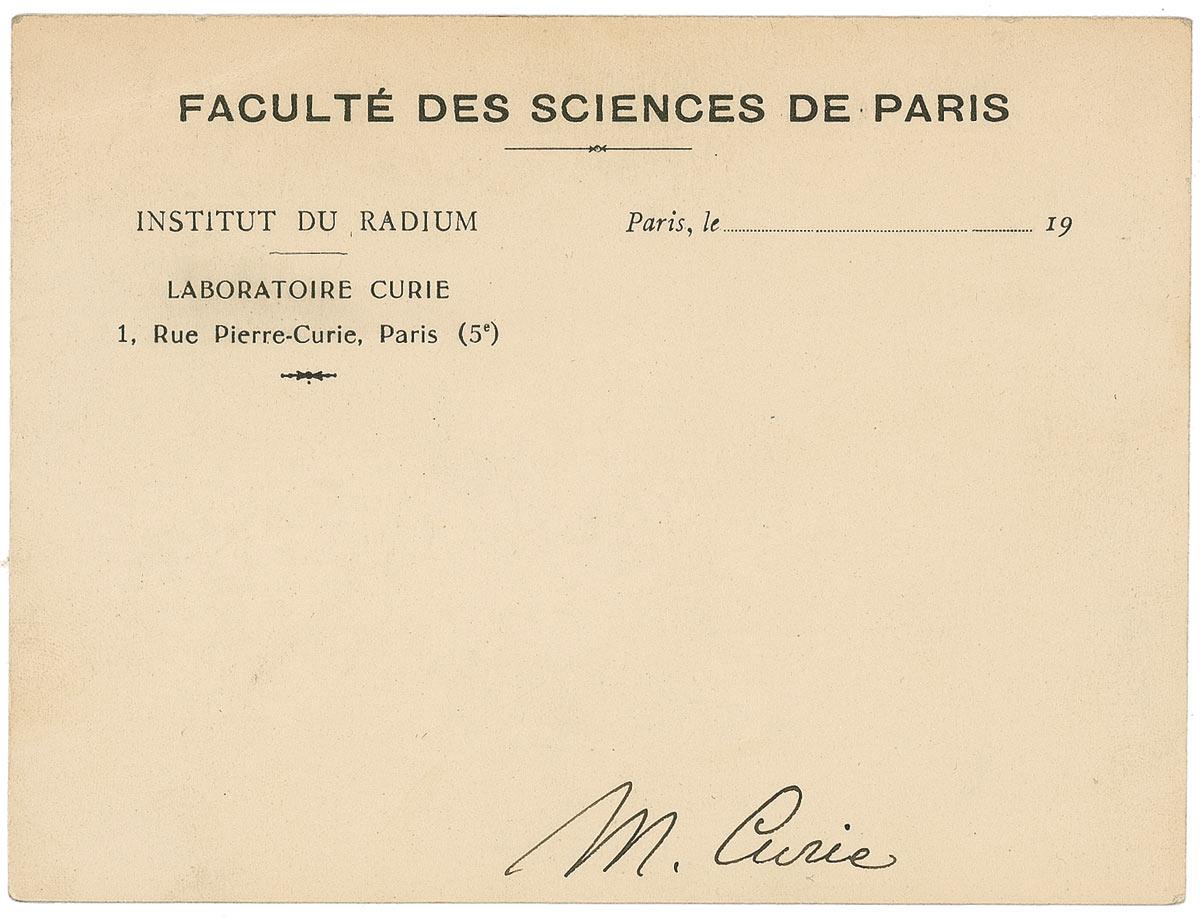 Polish-born French physicist (1867-1934), she and her husband Pierre discovered two new elements, polonium and radium, in 1898. In 1911 she won the Nobel Prize for Chemistry. She died of leukemia brought about by her work with radioactive material. Crisp and precise ink signature, “M. Curie,” on an off-white 5.5 x 4 Faculte Des Science De Paris, Institut Du Radium card. In fine condition, with a mild shade of toning, and some light creasing to top left corner.