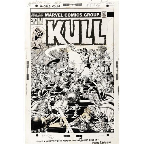 Robert E. Howard's famed axe-man, King Kull, cuts a swath through the murderous minions of the Scorpion God in this thrilling cover scene. Marie and John Severin depict the scene in their usual magnificent Marvel manner. A Bronze Age beauty of a cover, with a hard-hitting Howard hero, as drawn by the sensational Severins -- what more could a sword and sorcery fan want?!? This piece has a few glue stains left behind from missing type elements under the main title, a missing caption at the lower left, and a missing word balloon at the lower right; otherwise, the piece is in Very Good condition, with an image area of 10" x 15". <BR><BR><b>Shipping:</b> Small Flat (<a target="_blank" href="http://www.heritageauctions.com/common/shipping.php">view shipping information</a>)