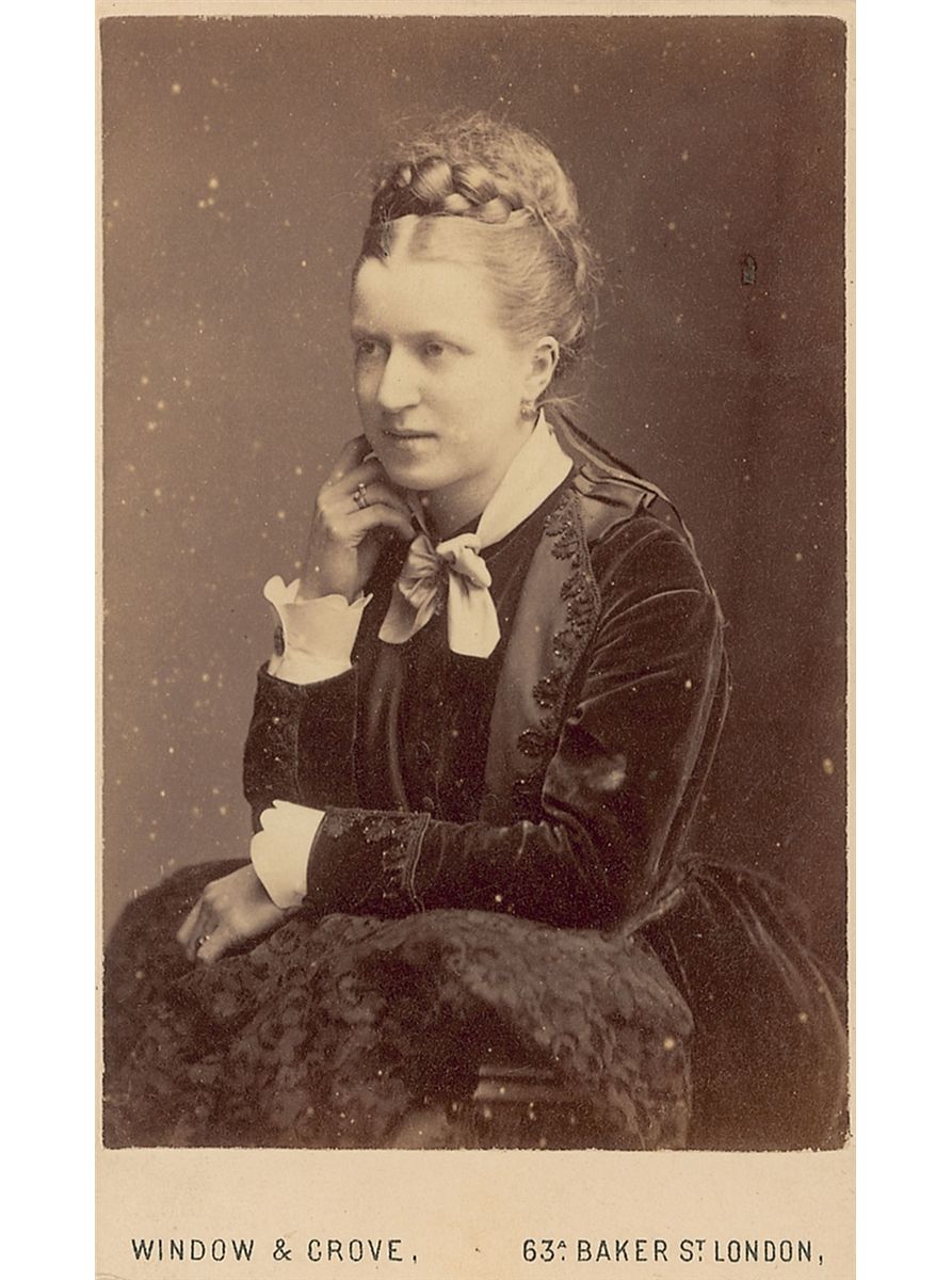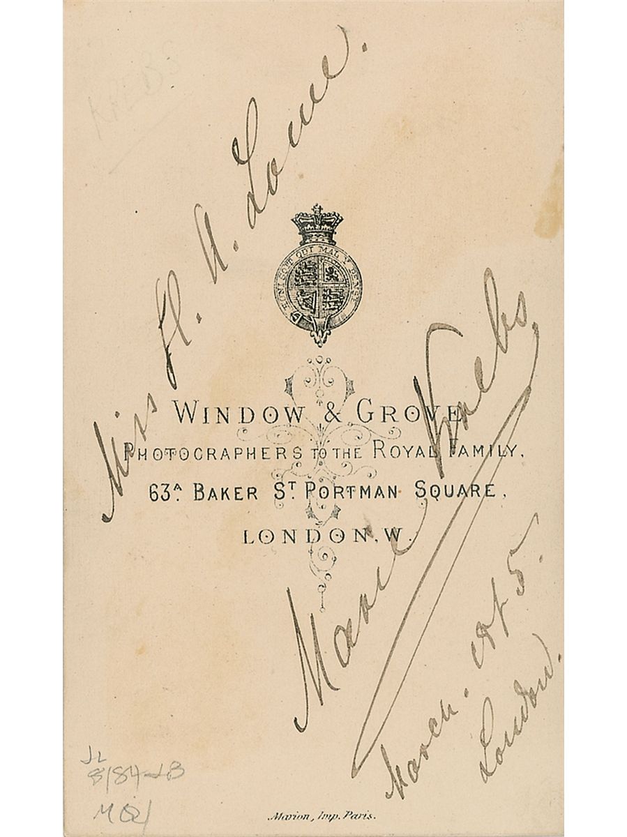 German piano virtuoso (1851–1900). Original 2.25 x 4 carte-de-visite photo by Window and Grove of London, signed and inscribed on the reverse in black ink “Miss H. A. Lowe, Marie Krebs, March 1875, London.” In fine condition, with a light impression to top right of image and some light toning and soiling to reverse.