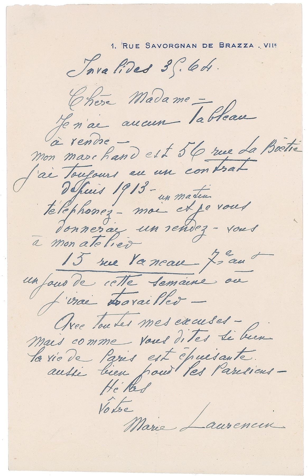 ALS in French, one page, 5 x 8, personal letterhead, no date. Letter replying to a woman looking to purchase her paintings, referring her to the agent who has handled her sales since 1913. She concludes with an invitation to visit her studio. In very good to fine condition, with light creasing, intersecting folds, and three small pieces of archival tape on the back of the top edge.