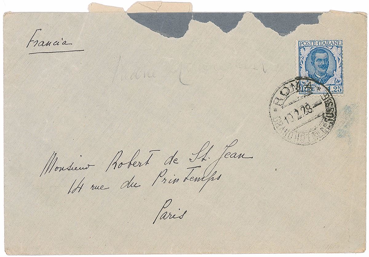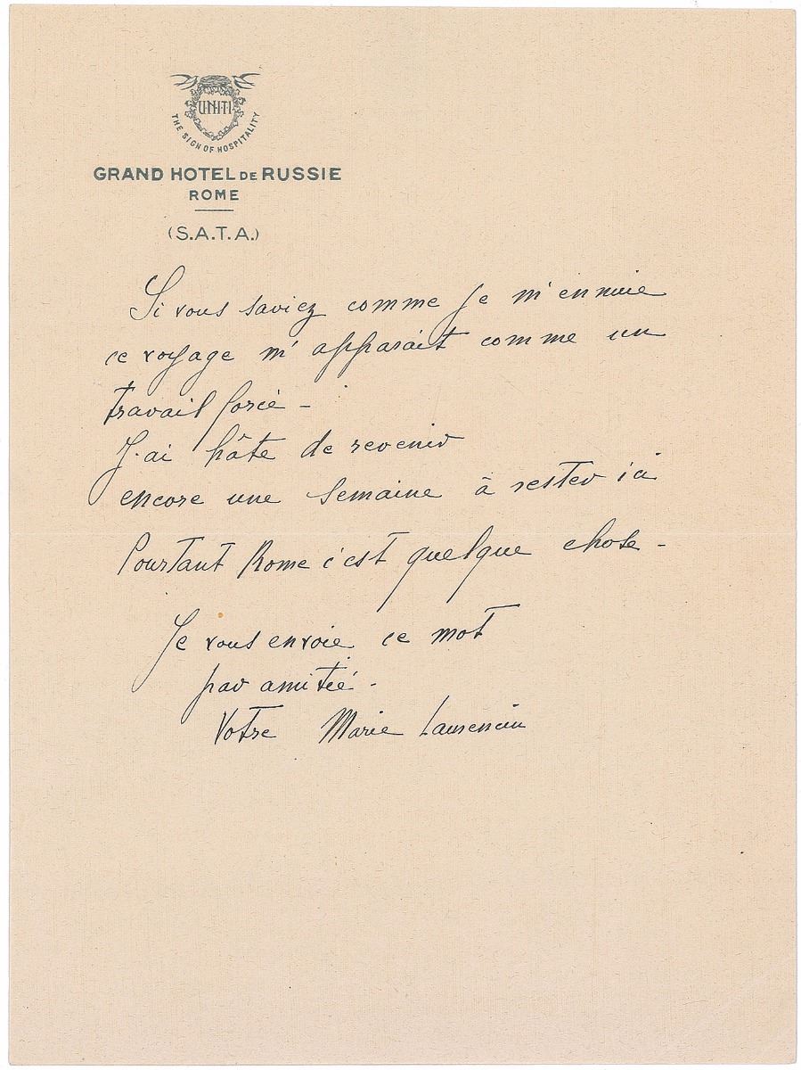 French painter (1883–1956) known as one of the few female Cubists. ALS in French, one page, 5.5 x 7.5, Grand Hotel de Russie letterhead, no date but postmarked October 2, 1928. Untranslated letter complaining about being in Rome. In fine condition, with a small crease to lower right corner. Accompanied by the original mailing envelope, addressed in Laurencin’s own hand to writer Robert de St. Jean.
