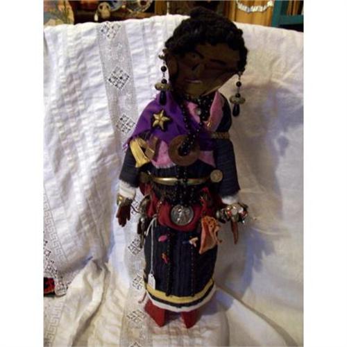 A very unusual doll or figure, made from a split cedar knee (I Think) and copper for the head, all manner of cloth, and coins, buttons, objects from different countries, a cabinet door pull, among other things. The copper head is wrapped in black yarn, and her face is lookimg down to the ground lookimg for anything of interest, to use in her spell, or incantations. The story goes that handsome jack told her if she would make him rich he would marry her. So she did, and when she showed up in her wedding dress, he said "Oh no Marie, you are too ugly for a rich man like me!" So Marie did one of her spells, and Jack disappeared, never to be seen or heard from again. This doll came from a collection of black memorabilia, collected by a man who traveled extensively and left this collection to his daughter. The figure is 23 inches tall, 8 inches wide, and weighs at least 5 pounds. I am a dealer of 15 years, located in the same building, and well known in my community. Thank you for shopping in the land of Enchantment.