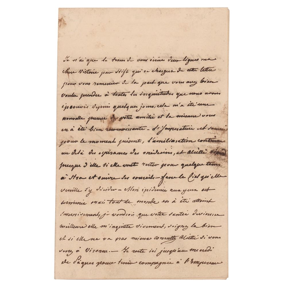 ALS in French, signed ‰ÛÏLouise,‰Û one page both sides, 4 x 6, April 9, 1816. Untranslated handwritten letter by the former Empress of the French. In fine condition, with a few small stains, and splitting to the top of the hinge.
