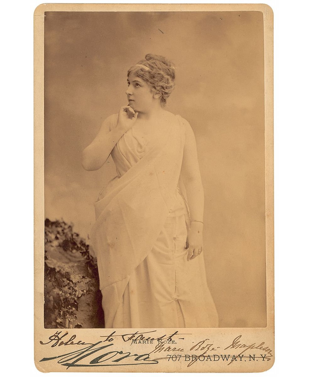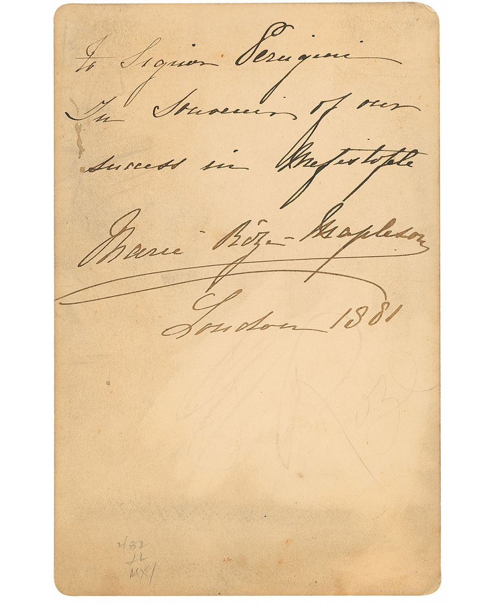 French operatic soprano (1846–1926) especially celebrated for her interpretation of the title role in Bizet's Carmen. Original 4.25 x 6.5 cabinet photo by Mora of New York, signed in the lower border in black ink, identifying her character as Helen from Faust. Also signed and inscribed on the reverse to a gentleman, and dated London, 1881. Light toning and soiling to the mount, slight silvering to dark areas of the image, and scattered marks and pencil notations to reverse, otherwise fine condition.