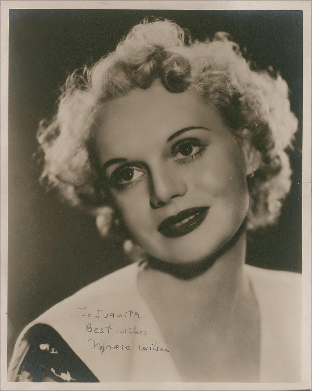 Vintage matte-finish 8 x 10 photo, signed and inscribed in fountain pen “To Juanita, Best wishes, Marie Wilson.” A couple corner tip creases, small brush to beginning of signature, and a touch of scattered light silvering, otherwise fine condition.