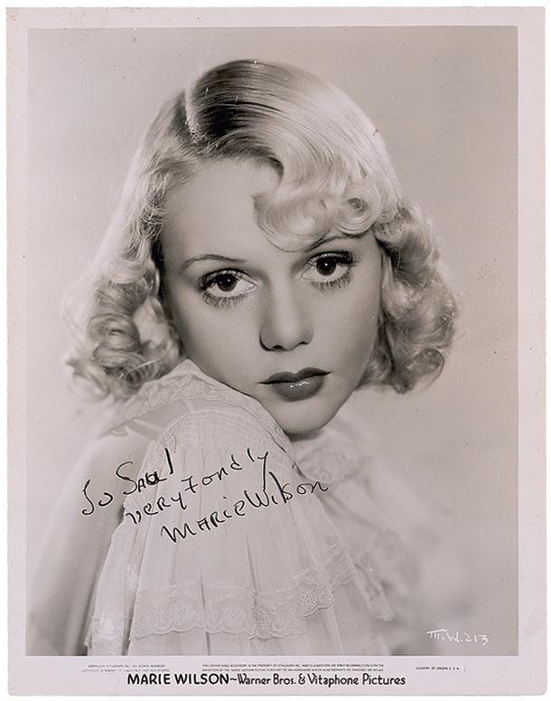 Adorable vintage glossy 8 x 10 Warner Brothers publicity photo of a doll-like Wilson, signed and inscribed in-person in fountain pen, “To Saul, Very Fondly, Marie Wilson.” Reverse of photo bears collector’s stamp date of September 30, 1939, the date the signature was acquired. Light creasing through the image, some surface impressions and light rubbing marks, otherwise fine condition. Saul Goodman Collection.