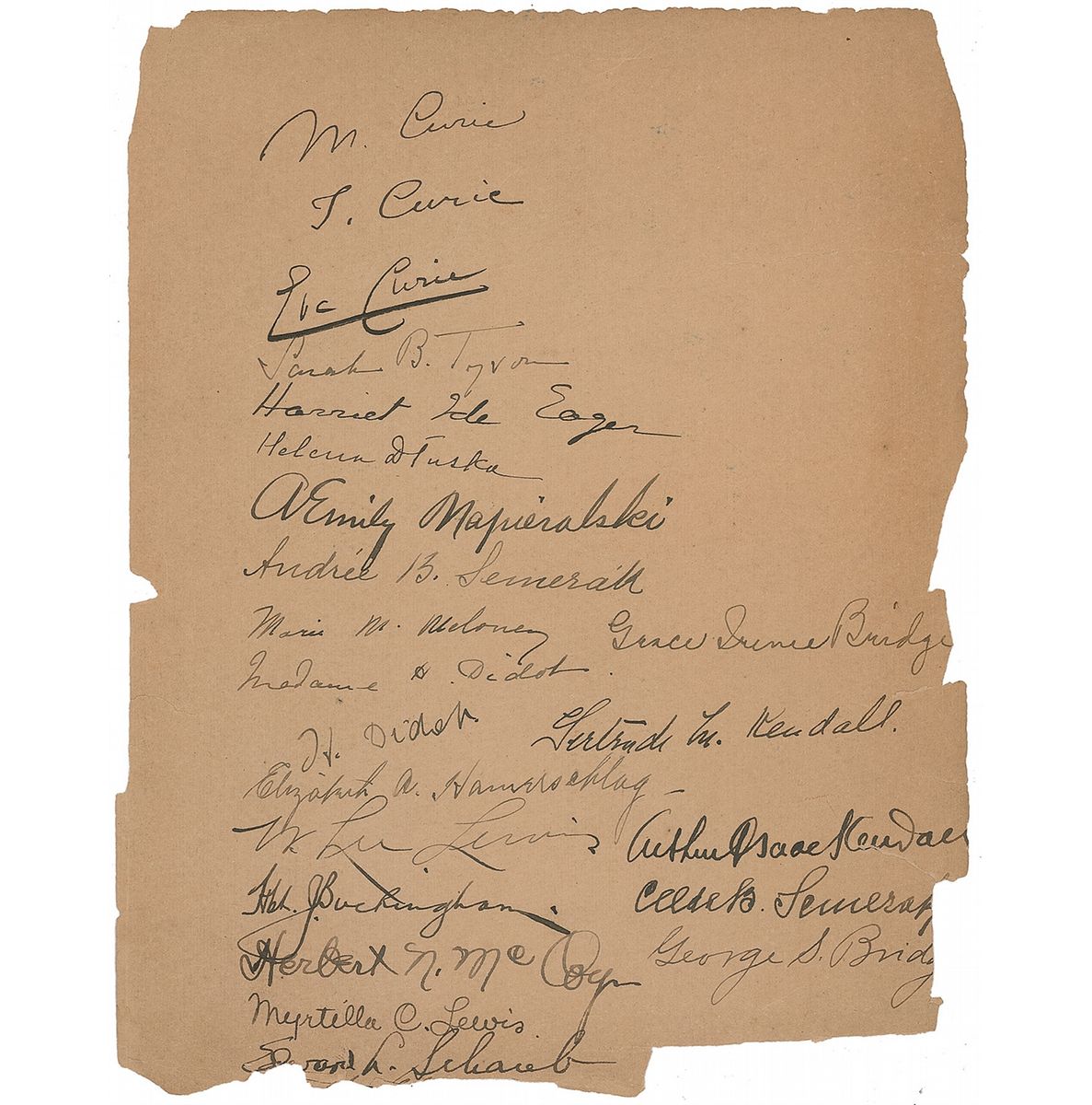 Ink signatures of Marie Curie, “M. Curie,” Pierre Curie, “P. Curie,” and their daughter “Eve Curie,” on an off-white 6.5 x 8.5 album or guest book page. Page is additionally signed by 19 others, including: Harriet Ide Eager, author; A. Emily Napieralski, influential Polish figure in Chicago; Marie Mattingly Meloney, journalist, editor, socialite, and organizer of a fund drive to support Curie’s research; Henri Didot, French publisher and engraver; Herbert N. McCoy, chemist and author; Myrtilla C. Lewis, wife of Winford Lee Lewis, US Soldier and chemical warfare chemist; and Edward L. Schaub, philosopher and editor. In very good condition, with uniform toning, paper loss to edges, and a few edge tears, lightly affecting some of the other signatures. Eve was the only member of the Curie family who did not pursue a scientific career, instead becoming a writer and journalist, and the only family member to not receive a Nobel Prize. This page is the only dual-signed Marie and Pierre Curie item we have offered. Provenance: Estate of Lawrence Feinberg, papyrologist and specialist in ancient manuscripts turned antiquarian bookseller.