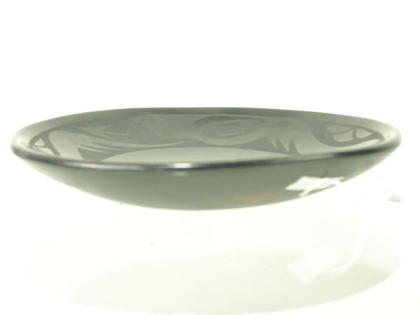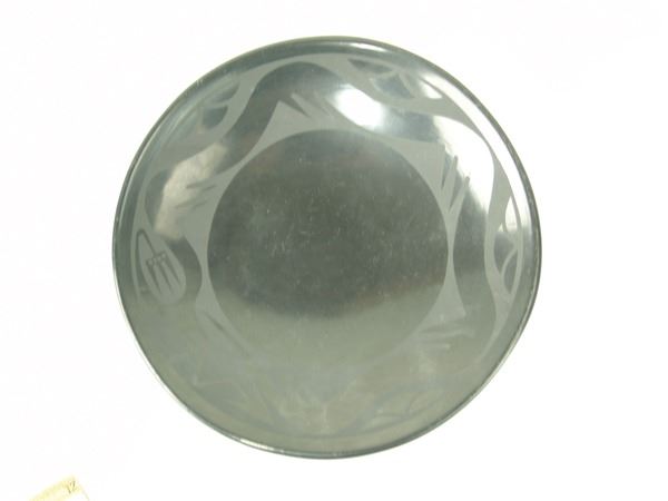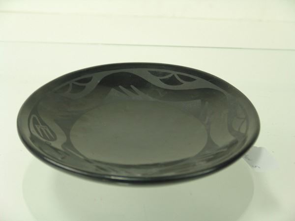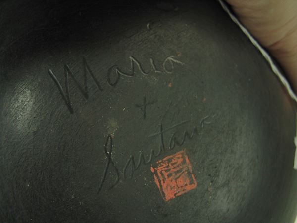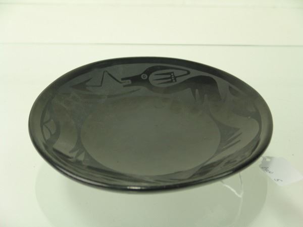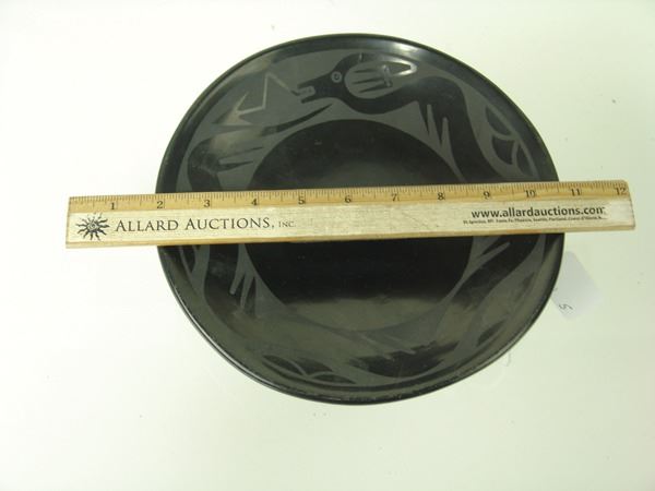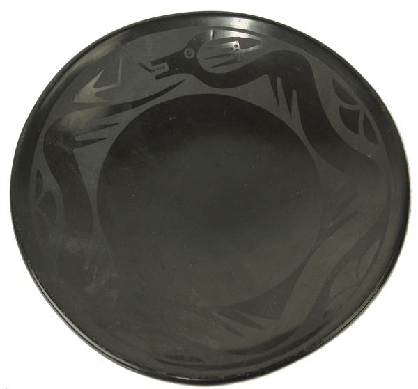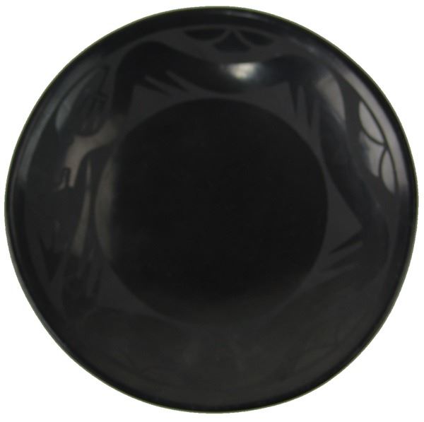 Classic, San Ildefonso black-on-black pottery plate with traditional Avanyu design band, done by Maria Martinez and her daughter-in-law, Santana. Very good condition. Minor surface scratches. Photo looks like is a funny shape, but it is perfectly round.