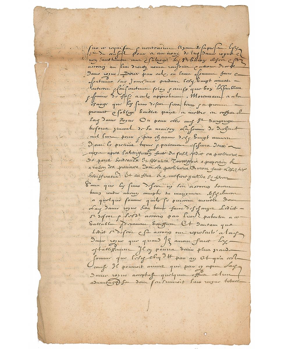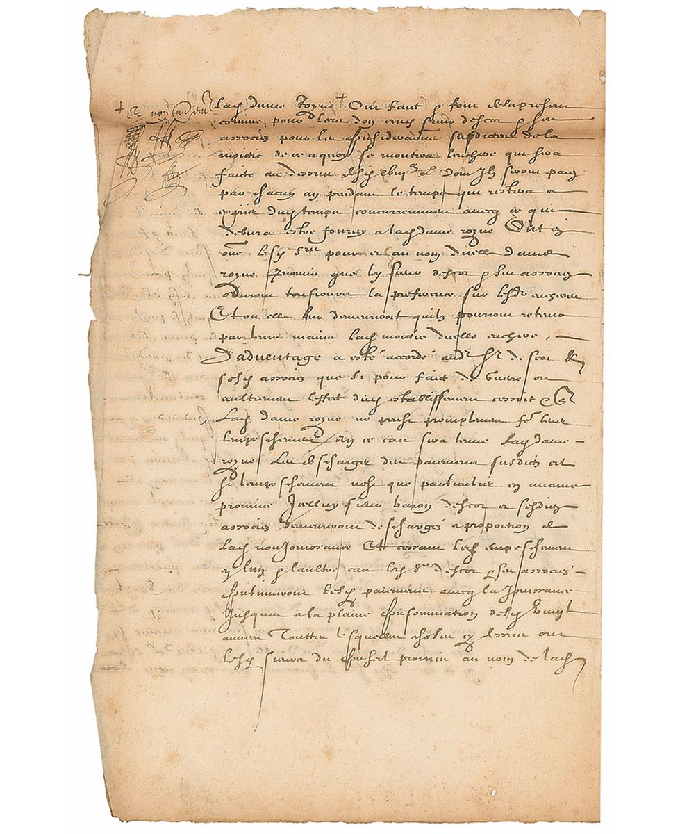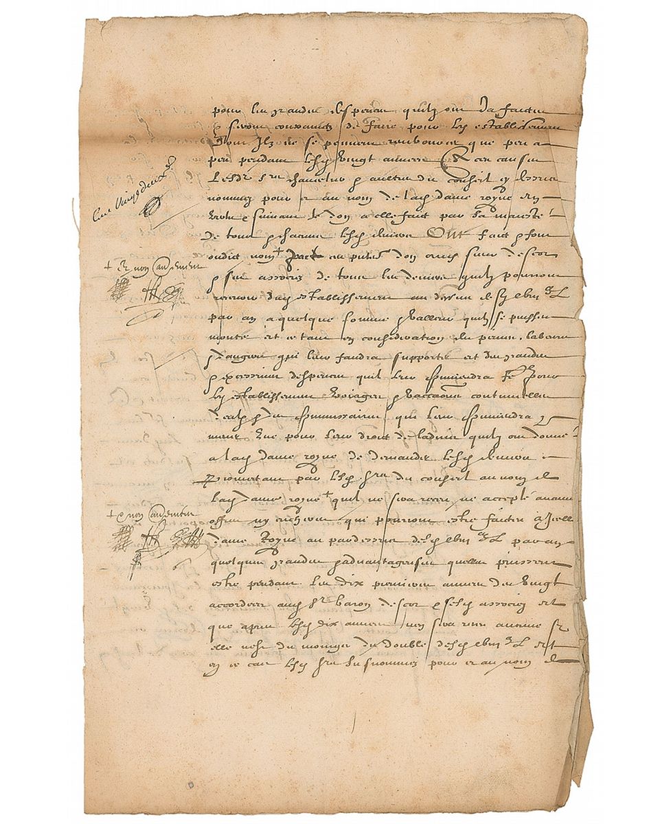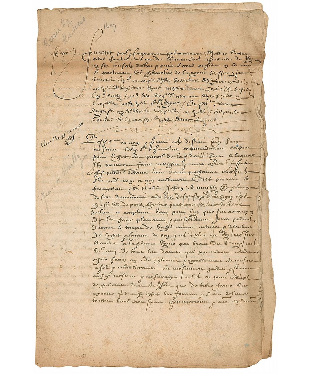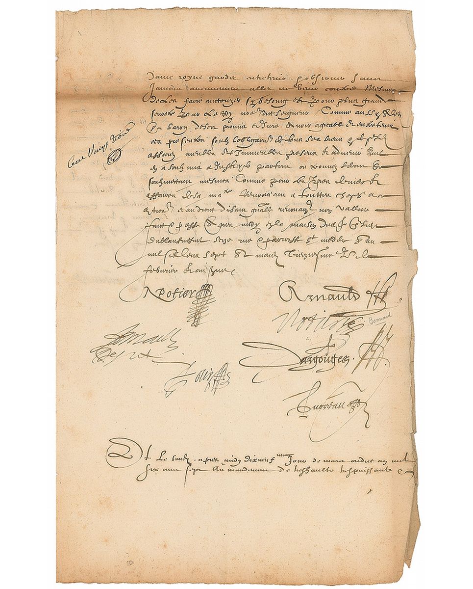 Queen consort of France (1573–1642) as the second wife of King Henry IV of France. She herself was a member of the wealthy and powerful House of Medici. Manuscript DS in French, signed “Marie,” three pages both sides, 9 x 14.25, 1607. Untranslated legal document signed at the conclusion by Marie de Medici and countersigned by two public royal notaries. In very good condition, with intersecting folds, a band of toning to the upper portion, and mild foxing. In 1607, Marie gave birth to Nicholas Henri, Duke of Orleans, who was her second son with Henry IV and heir presumptive to the throne; sadly, he would pass away just four years later as a result of an epileptic attack. A scarce and highly desirable document signed by one of the most powerful women of the era.