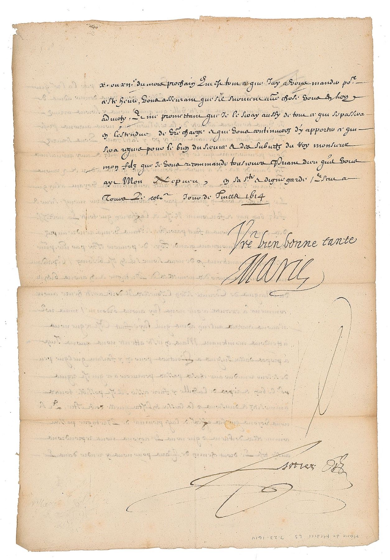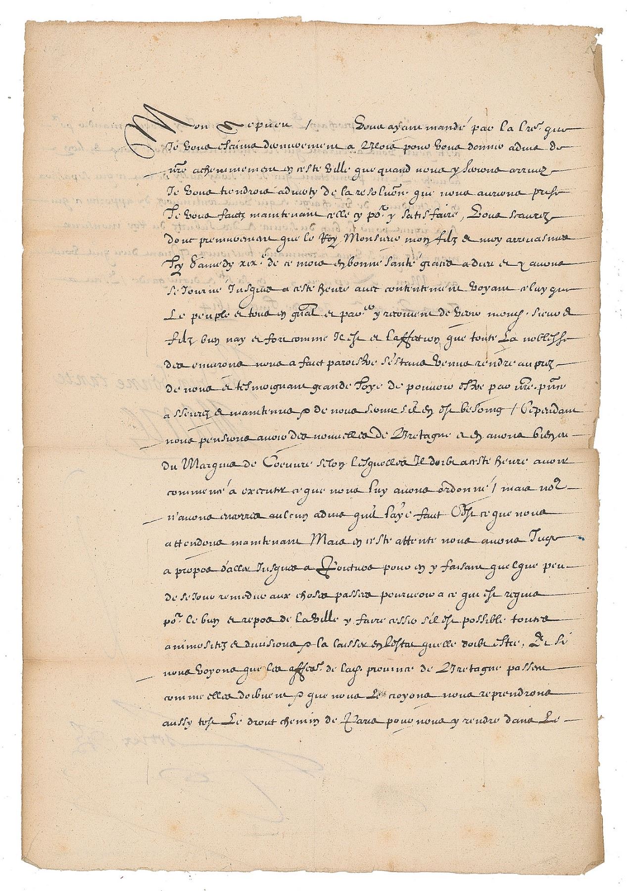 Queen consort of France (1573–1642) as the second wife of King Henry IV of France, and regent of France following his assassination; she herself was a member of the wealthy and powerful House of Medici. LS in French, signed “Marie,” one page both sides, 9.25 x 13.75, July 1, 1614. The Queen Regent informs her nephew of her plans to travel to Blois; upon her arrival there, on Saturday, the 19th, she will let him know of her decision. Marie asks him to tell her son, the King, that she remains in "good health, thanks to God, who stands by her." While "the people are ungrateful," the Queen is pleased with the affection that the nobility has shown her son, and she is happy to be of service to him whenever needed. Soon, news will arrive from the Marquis of Concino [known as the Marquis d’Ancre], who is at this moment in Brittany, carrying out her orders. If the city remains peaceful, Marie will take a short trip, hoping to meet with the "officers in power in Brittany," in order to make peace with them and repair the divisions among them. After her meeting with the officers, she will contact her nephew, and assures him of her control over the situation. In fine condition.