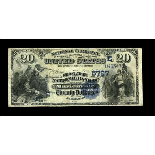 <B>Marienville, PA</B></I> - $20 1882 Value Back Fr. 581 <B>The Gold Standard NB</B></I> Ch. # (E)5727<BR>This note bears one of the great titles used by any National Bank, and one unique to this institution as well. While large notes from here are not truly rare, this is the only Value Back of any denomination reported from here to date. <B>Fine,</B></I> with a few small and quite inconsequential restorations at the bottom margin.<BR><BR><b>Shipping:</b> Coin/Currency (<a target="_blank" href="http://www.heritageauctions.com/common/shipping.php">view shipping information</a>)