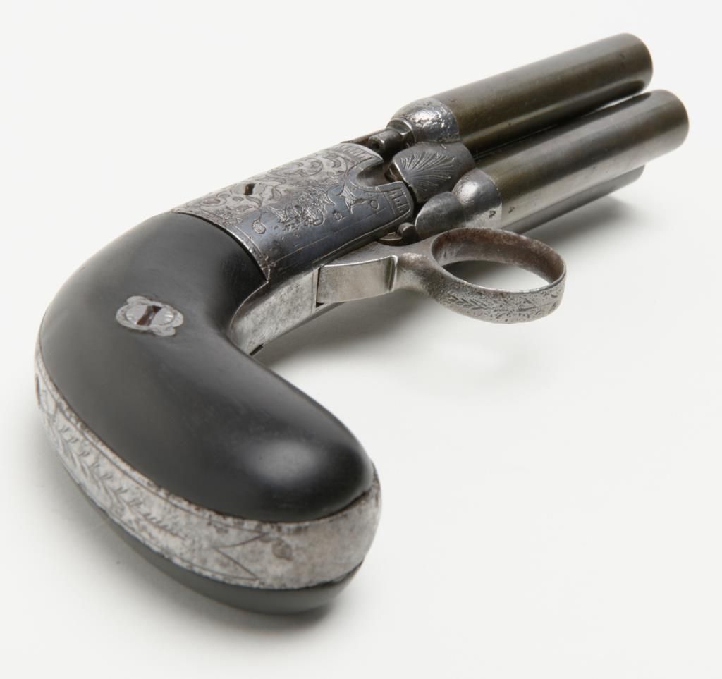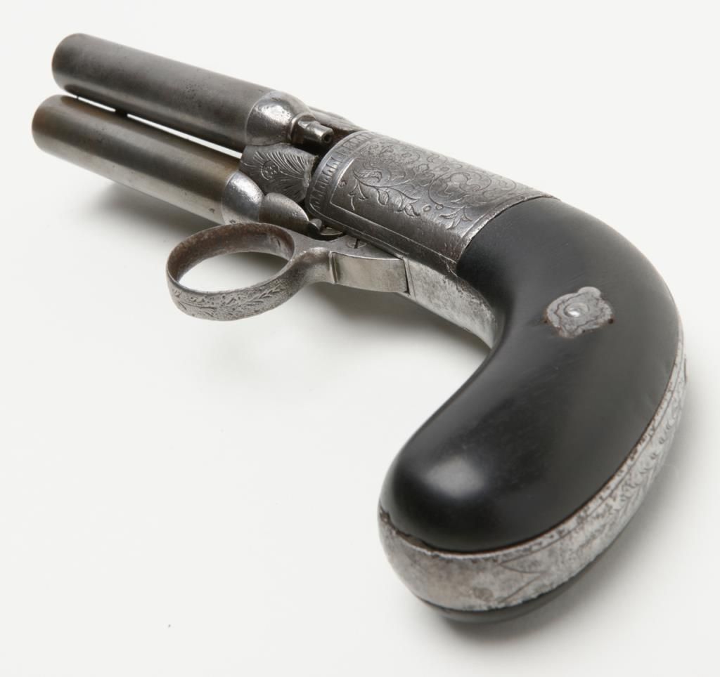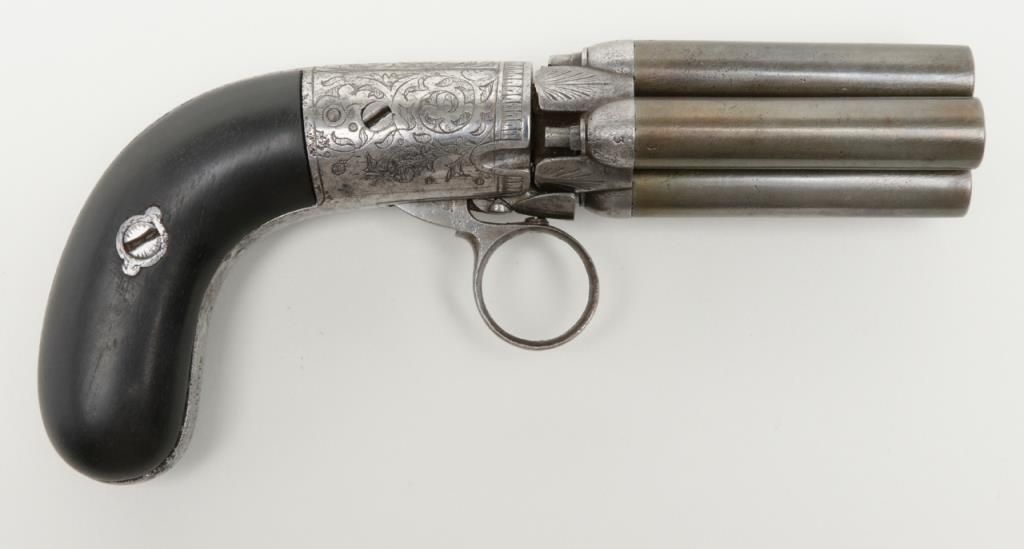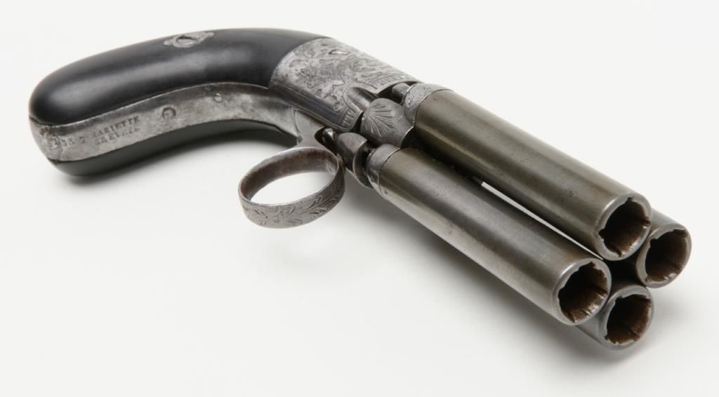 Mariette Brevette four shot of pepper box revolver in good condition showing engraved frame and blacken hardwood grips, serial numbered 1537 on the butt. This pepper box is in approximately 38 caliber percussion with four shots barrel groupmeasuring 3 ¼” and is nearly 7” overall. The frame and straps have been lightly cleaned and are in good condition. The barrels show traces of original blue finish going to a pleasant brown. The action works well and the barrels revolvenicely. The grips are very good plus and have been cleaned lightly. Mariette patented this under hammer design with ring trigger mechanism and licensed it to many European makers which is why this pepper box shows Belgian proofs. Est.:$650-$1300