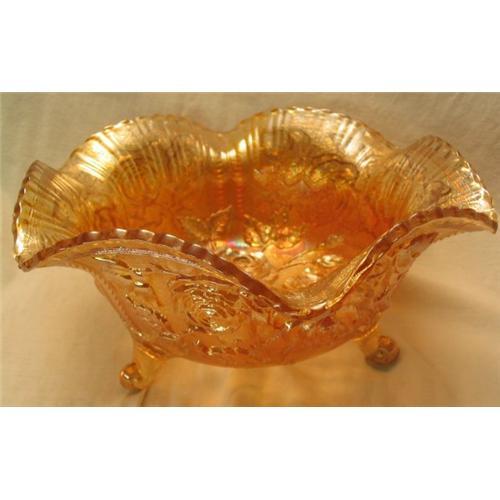Marigold carnival footed bowl with raised rose design both inside and out. Good irridescense and ruffled edge. Great shine and is in good condition.