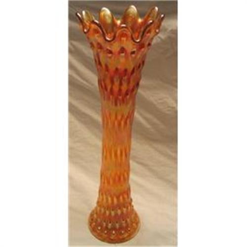 Very LARGE marigold irridescent swung type vase. It is covered with hobnails that were stretched as the vase was made. Excellent condition with no visible defects.