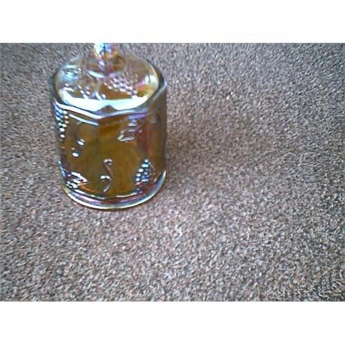 Thought to be the "Palm Beach" pattern from U.S.Glass shown on page 225 of Volume 6 of the Carnival Glass book by Bill Edwards and Mike Carwile (also page 196 in 8th edition). Another book shows it to be a Marigold color tobacco humidor possibly by Northwood and in the "grape & cable" pattern is valued at $275 to $300. We're not certain. It is owned by a former Oklahoma City TV personality who is "downsizing" and has moved into a retirement village.