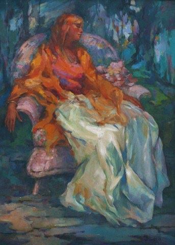 "On the Patio", woman in chair, 44" x 32'', signed lower right, measures overall with frame 53" x 41", -468206-
