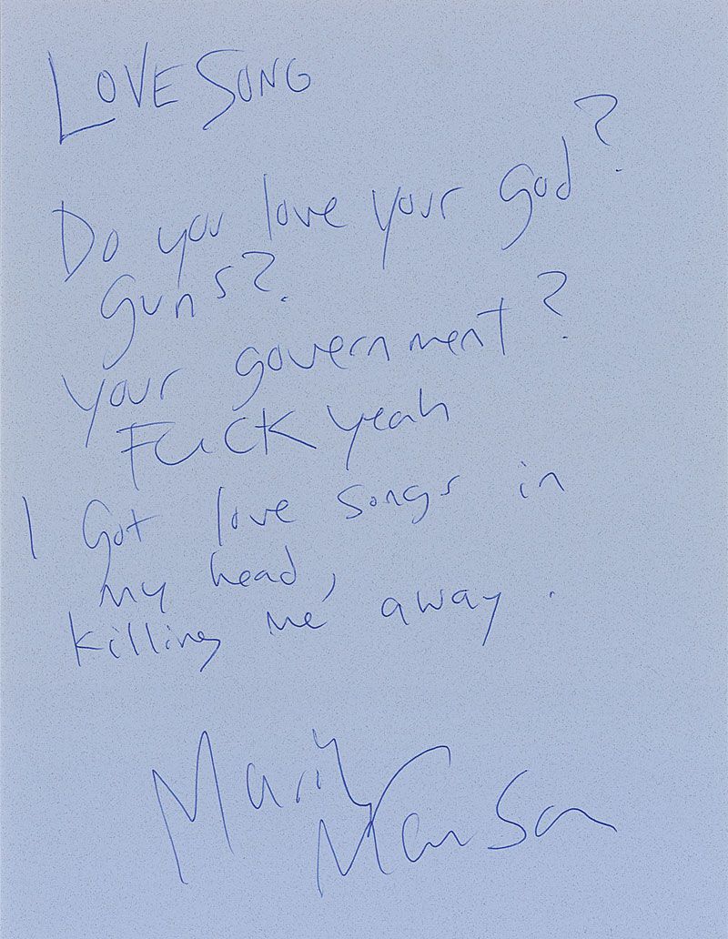 Uncommon souvenir handwritten lyrics to the chorus of ‘Love Song,’ written out by Manson on a light blue 8.5 x 11 sheet, signed at the conclusion in blue ballpoint. In fine condition.