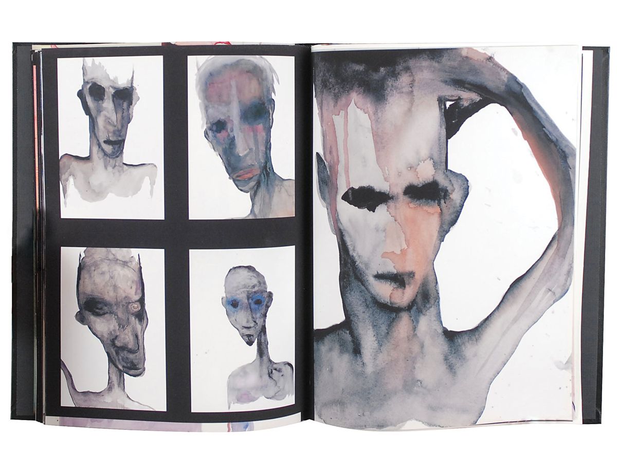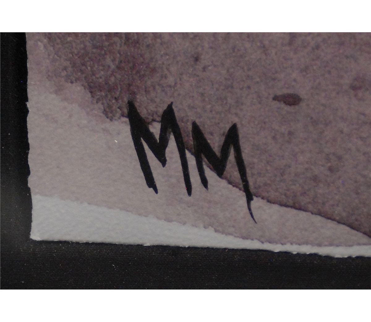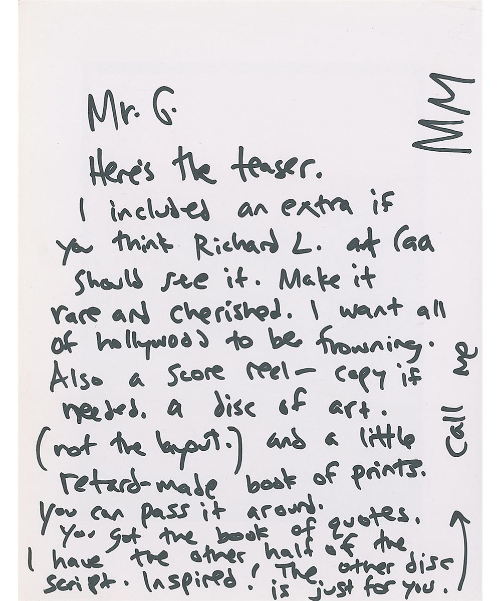 Incredibly desirable original self-portrait, watercolor on heavy canvas paper, 33.5 x 47.5, signed in the lower left corner, “MM.” Matted and framed to an overall size of 45.25 x 55. In fine condition. Accompanied by an ALS from Manson, signed “MM,” to “Mr. G,” which reads, “Here’s the teaser. I included an extra if you think Richard L. at Caa should see it. Make it rare and cherished. I want all of Hollywood to be frowning. Also a score-reel—copy if needed. A disc of art (not the layout) and a little retard-made book of prints. You can pass it around. You got the book of quotes. I have the other half of the script. The other disc is just for you.” Also included is the hardbound book of prints mentioned in the letter, featuring a full-page image of the painted portrait, and other impressive examples of Manson’s watercolor works.” Becoming interested in watercolors in the late 1990s, Manson originally sold his art to drug dealers. His first show, titled ‘The Golden Age of Grotesque’ took place in 2002, and was quite successful, even though his work was panned by critics, several of his paintings sold quickly. This particular self-portrait, done in 1998 as a part of his Gray Series, was used on the cover for his ‘Dope Show’ single, which was nominated for a Grammy award in 1999. Manson's artwork has been featured in galleries and special exhibits around the world and has become increasingly popular and highly desirable by contemporary art collectors. Provenance: Gerry Harrington.