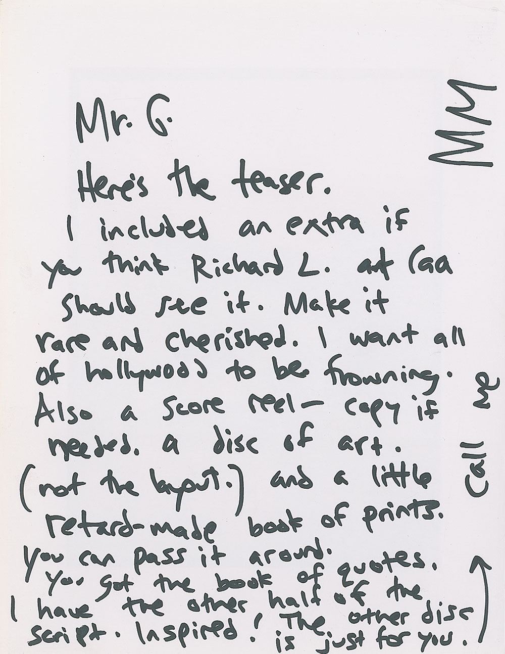 Rare ALS signed "MM," on the reverse of an 8.5 x 11 printout of one of Manson’s artworks, to "Mr. G.” In full: "Here's the teaser. I included an extra if you think Richard L. at Caa should see it. Make it rare and cherished. I want all of Hollywood to be frowning. Also a score reel—copy if needed. A disc of art (not the layout) and a little retard-made book of prints. You can pass it around. You got the book of quotes. I have the other half of the script. The other disc is just for you." Includes a massive 33.5 x 47.5 lithograph print of Manson’s fantastically eerie self-portrait used for his Grammy-nominated ‘Dope Show’ single cover, with hand-embellished areas in the eyes. The imposing print has been mounted, matted, and framed to an overall size of 45.25 x 55. Also included is the hardbound book of prints mentioned in the letter, featuring impressive examples of Manson's watercolor works. In overall fine condition.