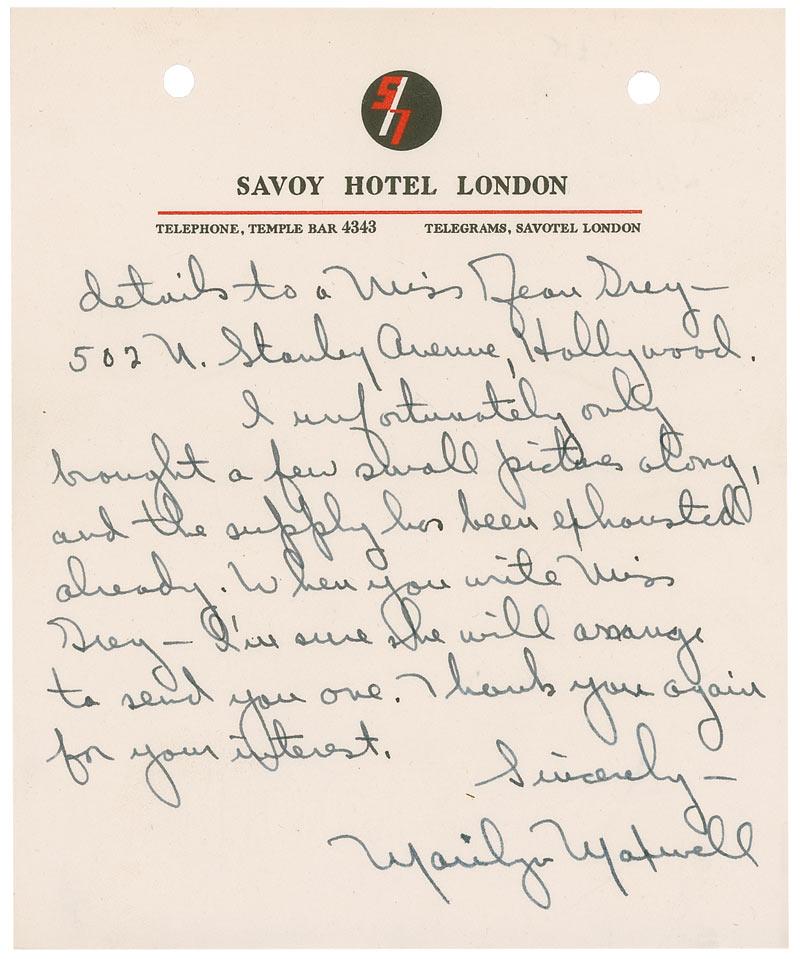 ALS, two pages, 5.25 x 6.5, Savoy Hotel London letterhead, July 26, 1948. Letter to a fan. In part: “I would be very honored to have you start a fan club for me. I do have a national fan club in America, and I believe we have an English branch. If you like, you can write for all details to Miss Jean Grey…I unfortunately only brought a few small pictures along, and the supply has been exhausted already. When you write Miss Grey–I’m sure she will arrange to send you one.” In fine condition, with a uniform shad of mild toning, and two punch holes to top of each page.