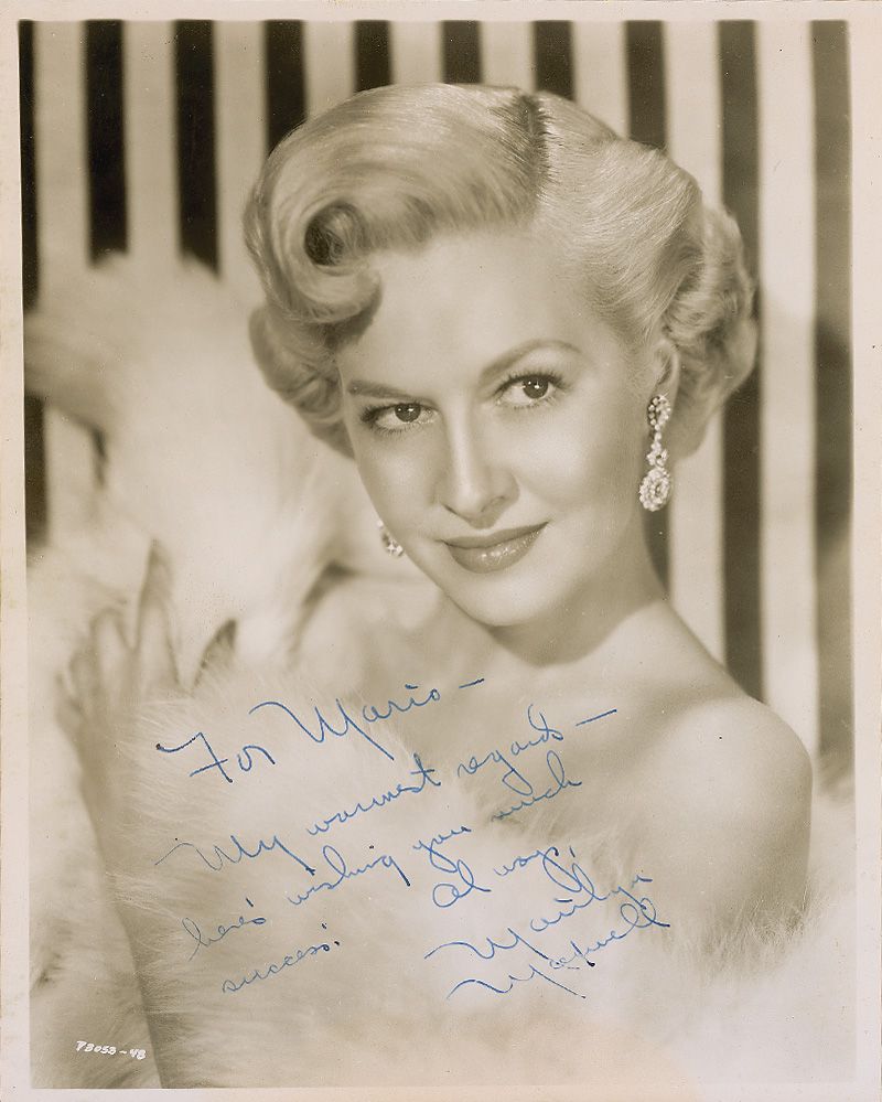 Alluring vintage glossy 8 x 10 photo of Maxwell wrapped in fur, signed and inscribed in fountain pen “For Mario—My warmest regards—here’s wishing you much success! Always, Marilyn Maxwell.” In fine condition, with mild toning to the bottom and light soiling to the borders.