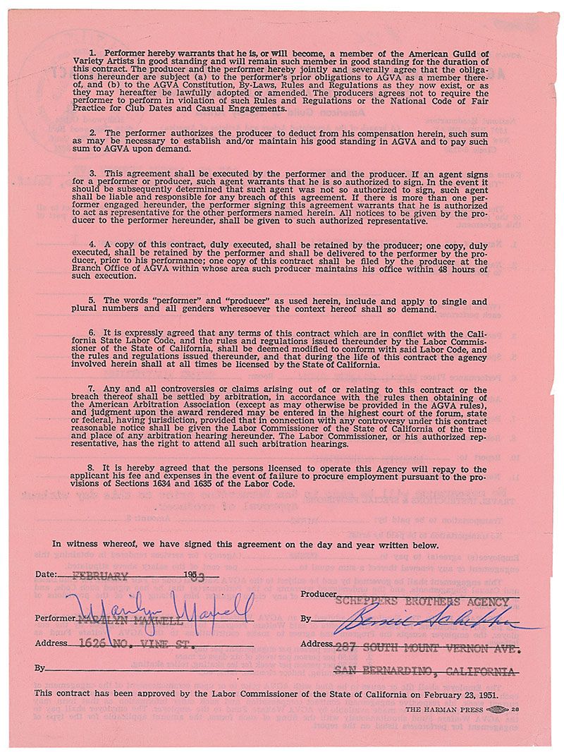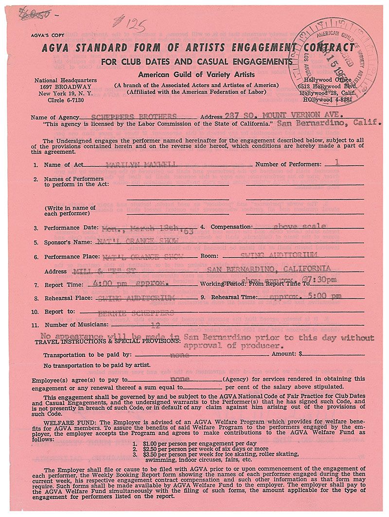 DS signed “Marilyn Maxwell,” one page both sides, 8 x 10.5, February 1963. AGVA Standard Form of Artists Engagement Contract between Maxwell and the Scheppers Brothers regarding a performance at the Nat’L Orange Show in San Bernadino, California, on March 18, 1963, between the hours of 4:00pm to 7:30pm in the Swing Auditorium. Creasing along the edges, two small tears, a stamp and two pencil notations, otherwise fine condition.