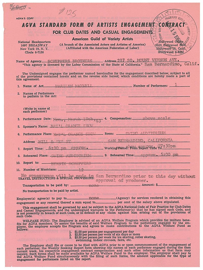 DS signed “Marilyn Maxwell,” one page both sides, 8 x 10.5, February 1963. AGVA Standard Form of Artists Engagement Contract between Maxwell and the Scheppers Brothers regarding a performance at the Nat’L Orange Show in San Bernadino, California, on March 18, 1963, between the hours of 4:00pm to 7:30pm in the Swing Auditorium. Creasing along the edges, two small tears, a stamp and two pencil notations, otherwise fine condition.