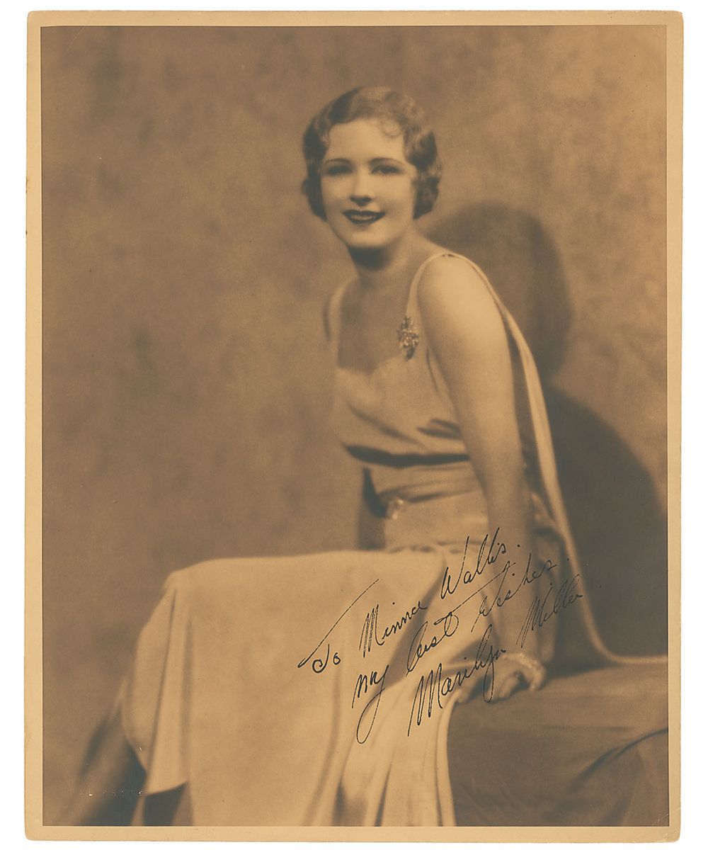 Broadway musical star (1898–1936) whose life was marred with bad marriages and alcoholism. She died at the age of 37 due to complications from nasal surgery. Matte-finish sepia 11 x 14 Hal Phyfe photo, signed and inscribed in fountain pen, “To Minnce Wallis, my best wishes, Marilyn Miller.” In fine condition, with a few small corner creases.