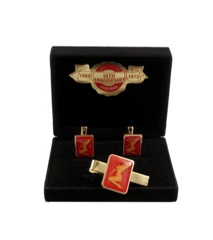 Marilyn Monroe 10th Anniversary Death Golden Dreams Cuff Links & Tie Pin - The 10th anniversary of Marilyn Monroe's death in 1972 inspired some very special and amazing Limited Edition Collectibles. This is one of them. This rare set of cufflinks and tie-pin of Tom Kelly's iconic Monroe "Golden Dream" photograph has never been removed from its original box and has its original sticker with the slogan "Never Before and Never Again". Tie-pin 2". Cufflinks .05" in diameter.