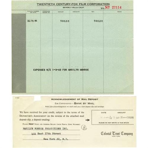 <B>Marilyn Monroe Twentieth Century-Fox Pay Stub and Deposit Slip.</B></I> A pay stub from Twentieth Century-Fox films for $500 dollars, dated December 31, 1959, accompanied by an acknowledgement of deposit for th same amount, dated January 7, 1960 and issued to Marilyn Monroe Productions. Monroe had one of her greatest successes in 1959 when she appeared in <I>Some Like It Hot.</B></I> In 1960, Monroe appeared in <I>Let's Make Love</B></I> directed by George Cukor and co-starring Yves Montand (with whom she had a steamy affair). Monroe was forced to appear in the picture because of her obligations to Twentieth Century-Fox, and while it failed commercially and critically, it included one of her best musical numbers, a rendition of Cole Porter's "My Heart Belongs to Daddy." Both items are in Very Fine condition with mild wear and toning.<BR><BR><b>Shipping:</b> Flat Material, Small (<a target="_blank" href="http://www.heritageauctions.com/common/shipping.php">view shipping information</a>)