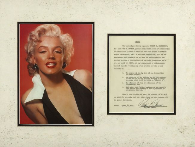 Typescript proxy agreement produced for Monroe, appointing Robert H. Montgomery and Paul J. Newlon to legally act on behalf of and to vote all shares of Marilyn Monroe Productions Inc. held by Monroe. With an excellent bold ink signature of Monroe and dated. Professionaly framed alongside a photograph of Monroe, with Odyssey Gallery Rare Autographs label to reverse. Marilyn Monroe Productions was formed in January 1955 with 51% of shares belonging to Monroe as President and 49% to her friend and business partner Milton Greene. Within two years their relationship had become strained as Monroe became caught in a power struggle between Greene and her husband Arthur Miller. This agreement signed on 10 April 1957 forms part of the end of the business arrangement and friendship between them, as the following day Monroe issued a public statement accusing Greene of mismanaging the company and began proceedings to force him to resign.