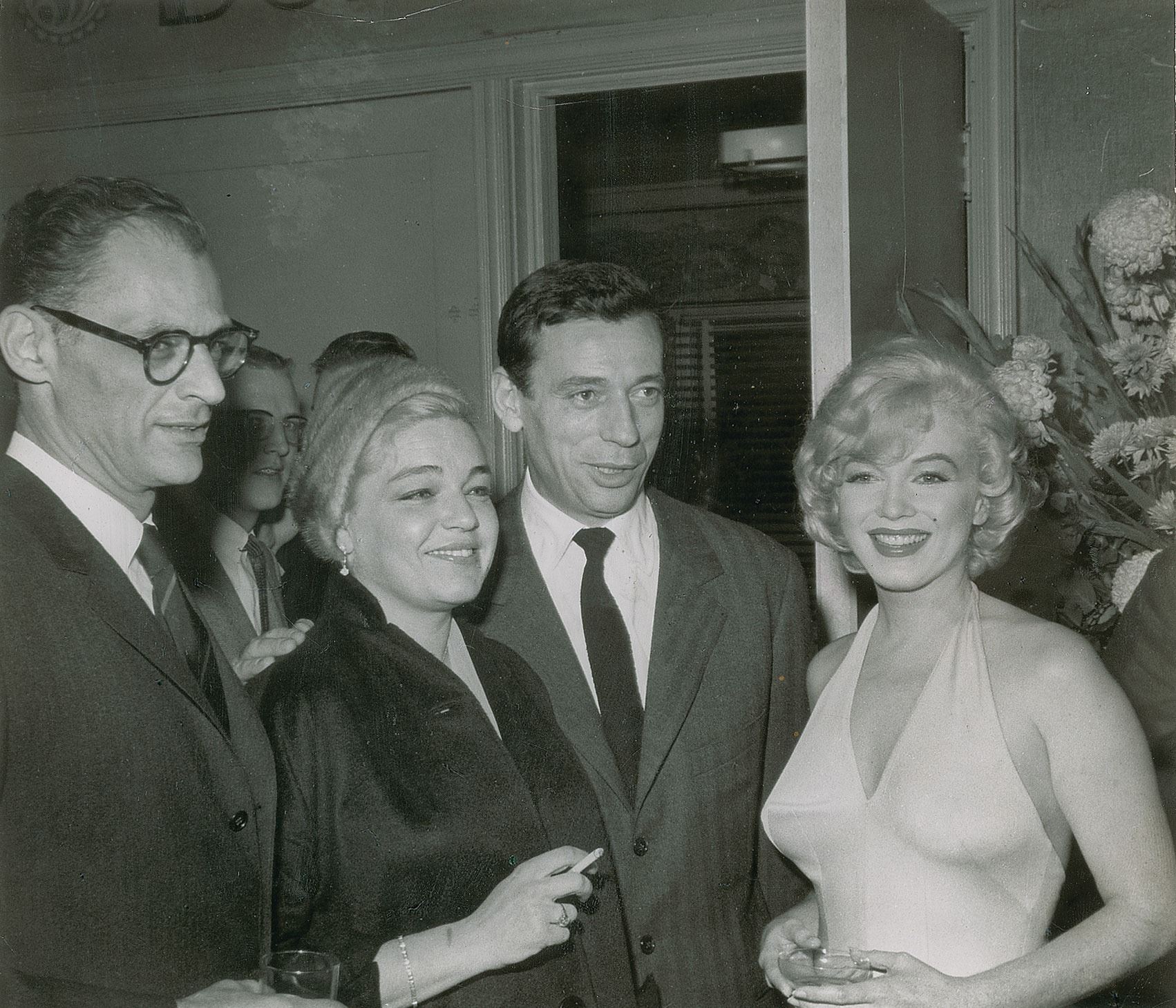 Original vintage glossy 8.5 x 7.25 silver gelatin photo of Monroe, Arthur Miller, Yves Montand, and Simone Signoret together at a party for Montand on January 15, 1960. Reverse bears a typed caption. In very good to fine condition, with trimmed edges and scattered light creasing.
