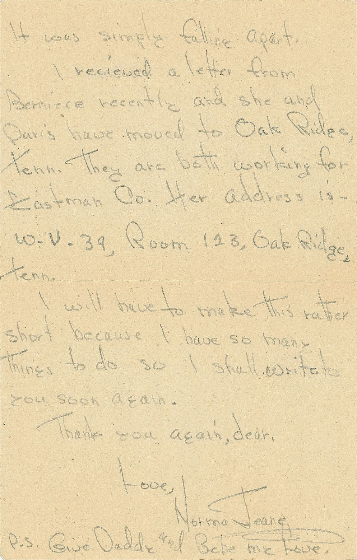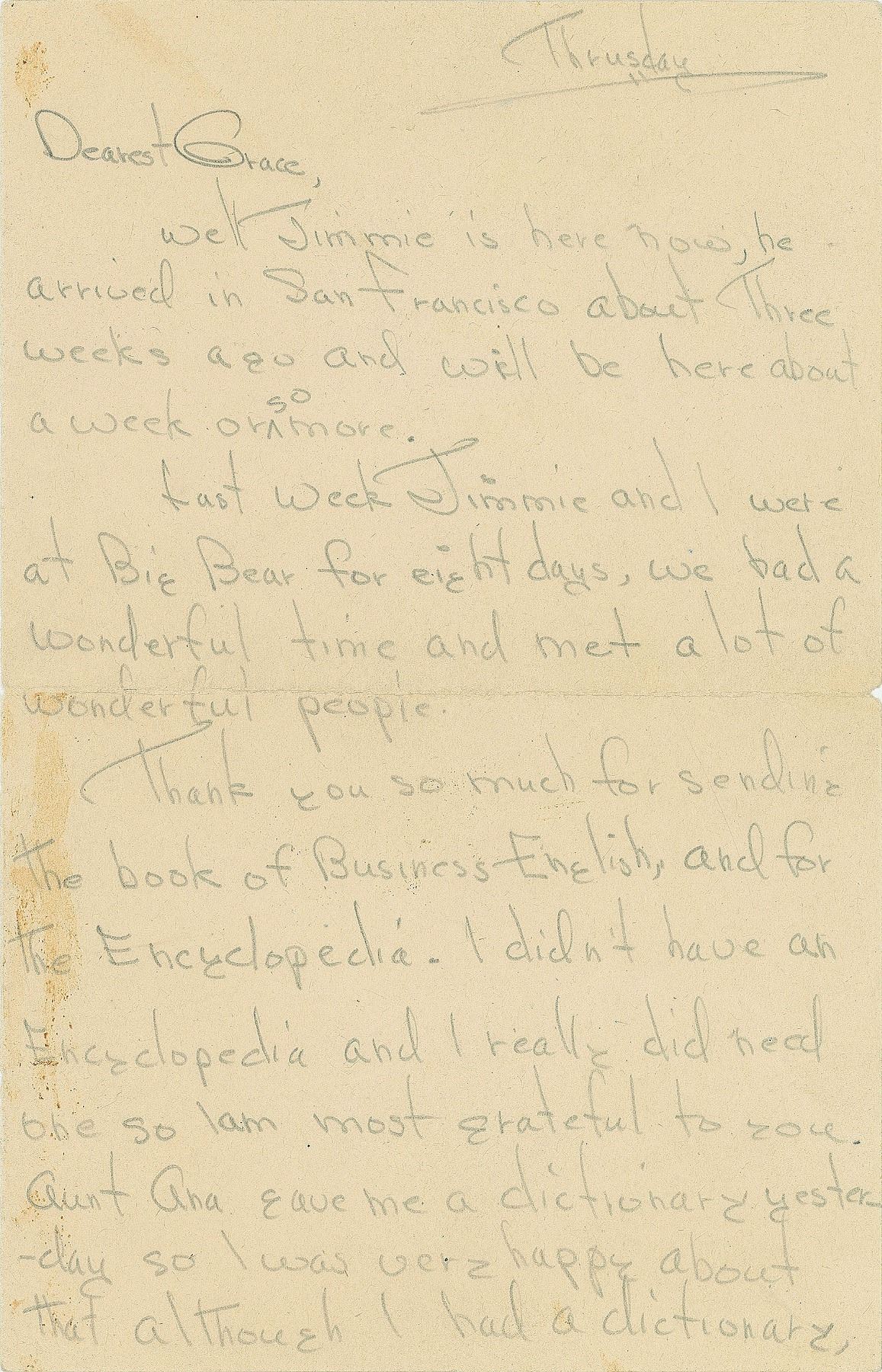 ALS in pencil signed “Norma Jeane,” two pages, 5.25 x 8.25, postmarked January 17, 1945. Letter to her legal guardian, Grace (McKee) Goddard, in full (spelling and grammar retained): “Well Jimmie is here now, he arrived in San Francisco about three weeks ago and will be here about a week or so more. Last week Jimmie and I were at Big Bear for eight days, we had a wonderful time and met a lot of wonderful people. Thank you so much for sending the book of Business English, and for the Encyclopedia. I didn't have an Encyclopedia and I really did need one so I am most grateful to you. Aunt Ana gave me a dictionary yesterday so I was very happy about that although I had a dictionary, it was simply falling apart. I recieved a letter from Berniece recently and she and Paris have moved to Oak Ridge, Tenn. They are both working for Eastman Co. Her address is W. V. 39, Room 123, Oak Ridge, Tenn. I will have to make this rather short because I have so many things to do so I shall write to you soon again. Thank you again, dear." Monroe adds a brief postscript: “Give Daddy and Bebe my love." In fine condition, with light stains to the left edge of the first page, and opening-related tears to the mailing envelope. Accompanied by the original mailing envelope, addressed by Monroe who incorporates her signature into return address field, "Mrs. J. E. Dougherty."
