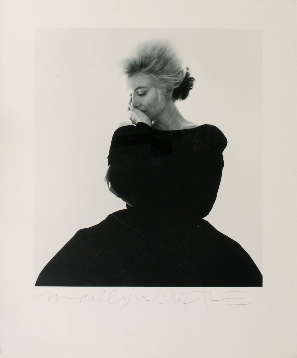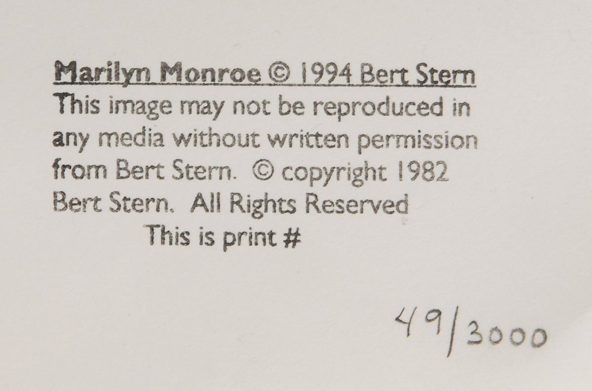 Limited edition 26 x 31.5 fine quality print of Monroe in a thoughtful pose, entitled ‘Marilyn, Hotel Bel-Air, Los Angeles, 1962,’ numbered 49/3000, signed in the lower border in black ink, “Marilyn, 1962.” Also signed in the lower right in pencil by the photographer, Bert Stern. Reverse bears a Bert Stern copyright stamp. Rolled and in fine condition. Accompanied by a certificate of authenticity signed by the photographer. This image was captured during two photography sessions commissioned for Vogue Magazine in 1962, and was later published in the book, Bert Stern: The Last Sitting.