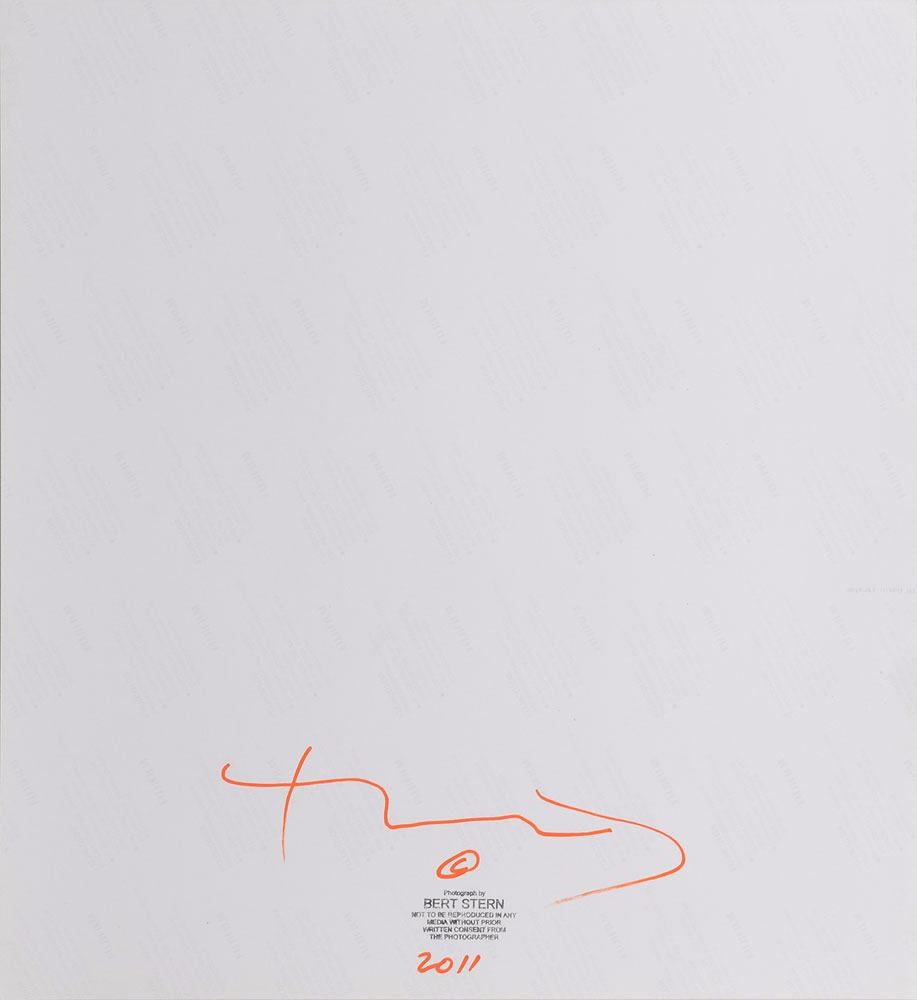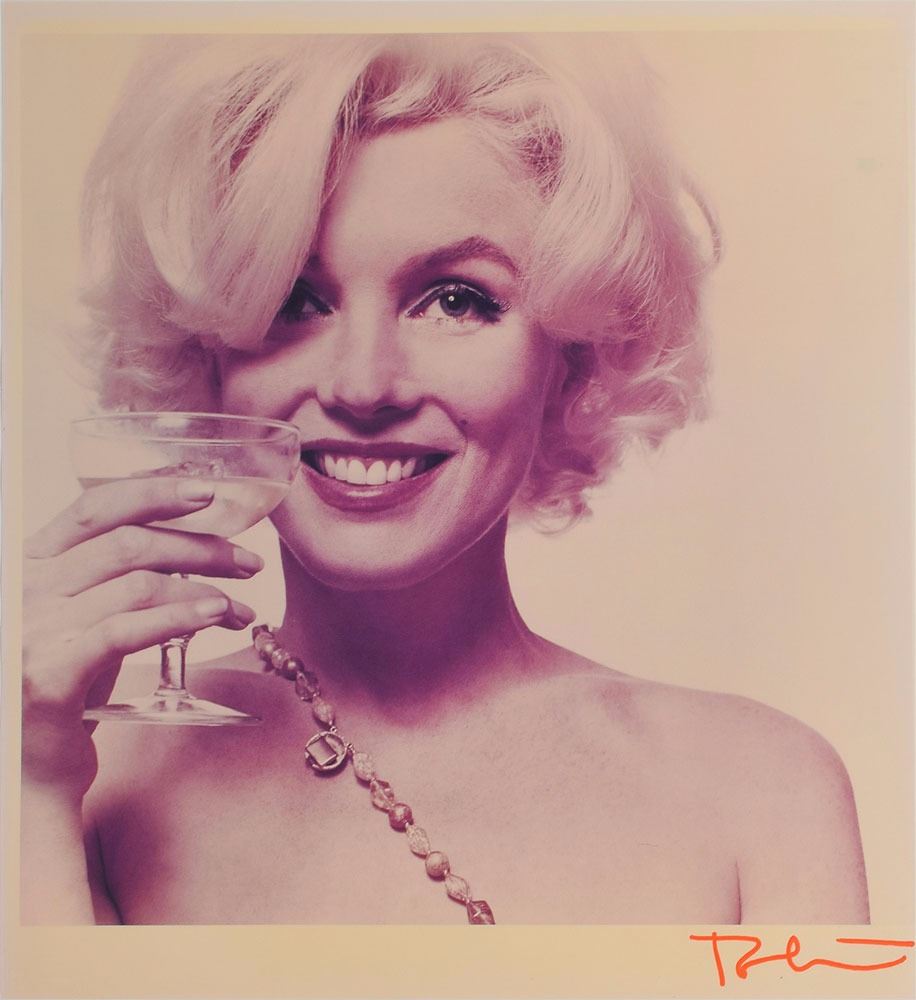 Beautiful high-quality color satin-finish 18.5 x 20 close-up photo of Monroe topless and holding a cocktail, taken by Bert Stern in the iconic 1962 'Last Sitting,' signed in the lower border in red ink by Stern. Stamped on the reverse with a Bert Stern copyright stamp and marked 2011. In fine condition.