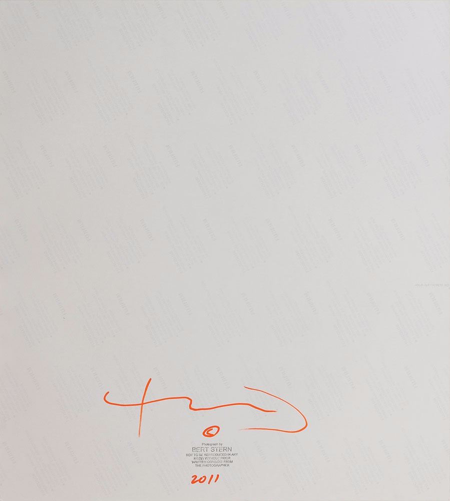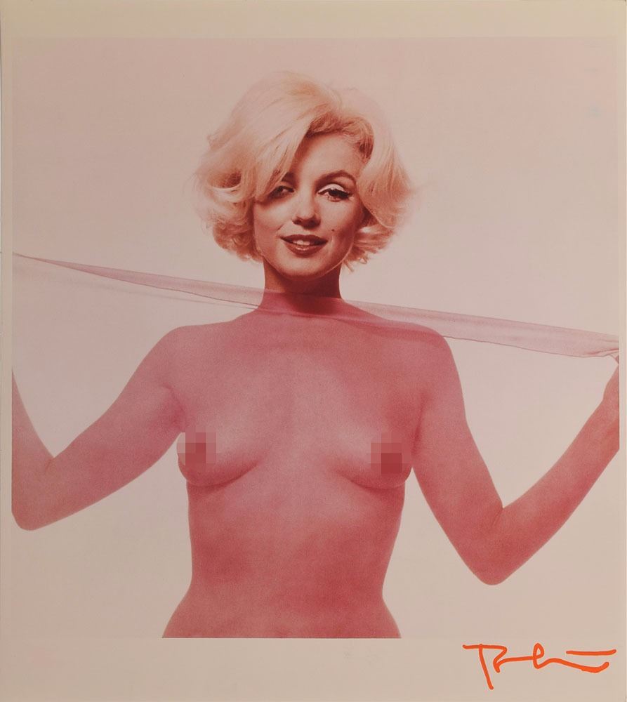 Sexy high-quality color satin-finish 18.5 x 21 photo of Monroe topless behind an ultra-sheer textile, taken by Bert Stern in the iconic 1962 'Last Sitting,' signed in the lower border in red ink by Stern. Stamped on the reverse with a Bert Stern copyright stamp and marked 2011. In fine condition.