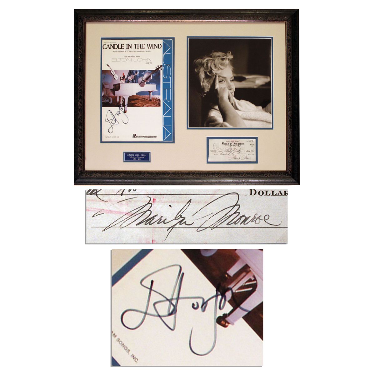 Marilyn Monroe check signed ''Marilyn Monroe'', made out fully in the star's hand, dated 22 May 1953. Check is addressed to a Mrs. Gladys Mertz for $200, drawn on the Bank of America Laurel-Sunset branch. Measures 5.75'' x 2.25''. Light creasing, discreet cancellation holes and remnants of a red stamp. Overall in very good condition with clear, bold writing. Marilyn's check comes attractively matted and framed with an Elton John signed booklet of sheet music to his song commemorating her life. Frame measures 29.25'' x 21.25''.