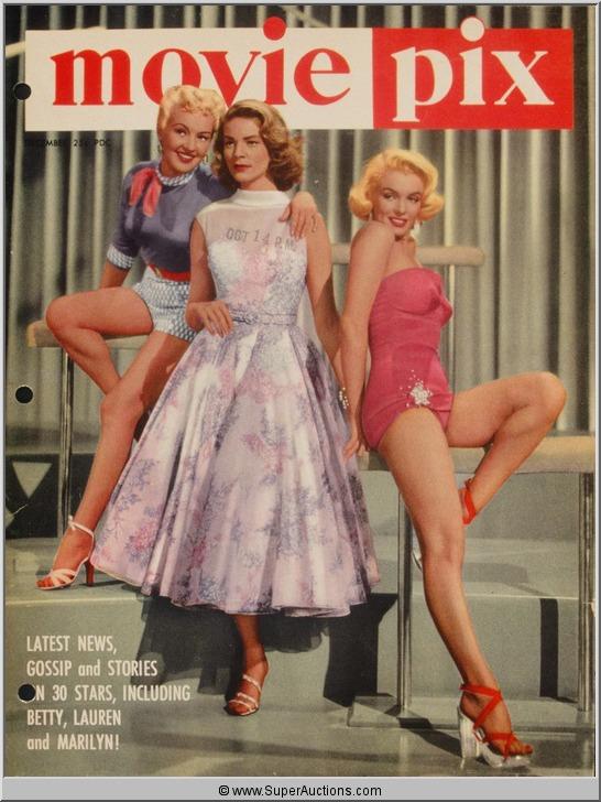 Color Transparency Slide of Marilyn Monroe who was featured as the Cover Girl on the cover of Movie Pix Magazine. Also featuring Betty Grable and Lauren Bacall on the cover. It is a transparency from a picture taken of the actual publication.