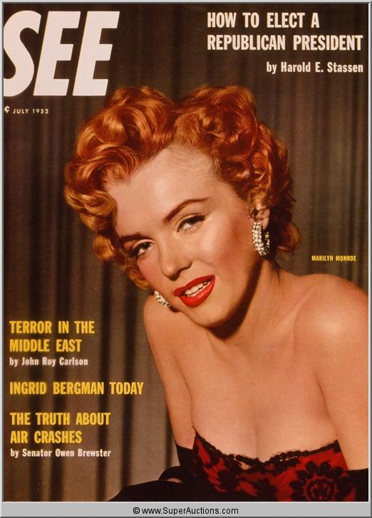 Color Transparency Slide of Marilyn Monroe who was featured as the Cover Girl on the cover of the July 1952 Issue of See Magazine. It is a transparency from a picture taken of the actual publication.